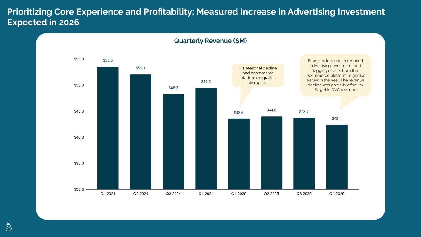 Prioritizing Core Experience and Profitability; Measured Increase in Advertising Investment Expected in 2026 Quarterly Revenue ($M) Q1 seasonal decline and ecommerce platform migration disruption Fewer orders due to reduced advertising investment and lagging effects from the ecommerce platform migration earlier in the year. The revenue decline was partially offset by $2.9M in QVC revenue