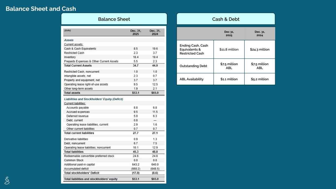Balance Sheet and Cash Balance Sheet Dec 31, 2025 Dec. 31, 2024 Ending Cash, Cash Equivalents & Restricted Cash $11.8 million $24.3 million Outstanding Debt $7.5 million ABL $7.5 million ABL ABL Availability $1.1 million $5.2 million Cash & Debt