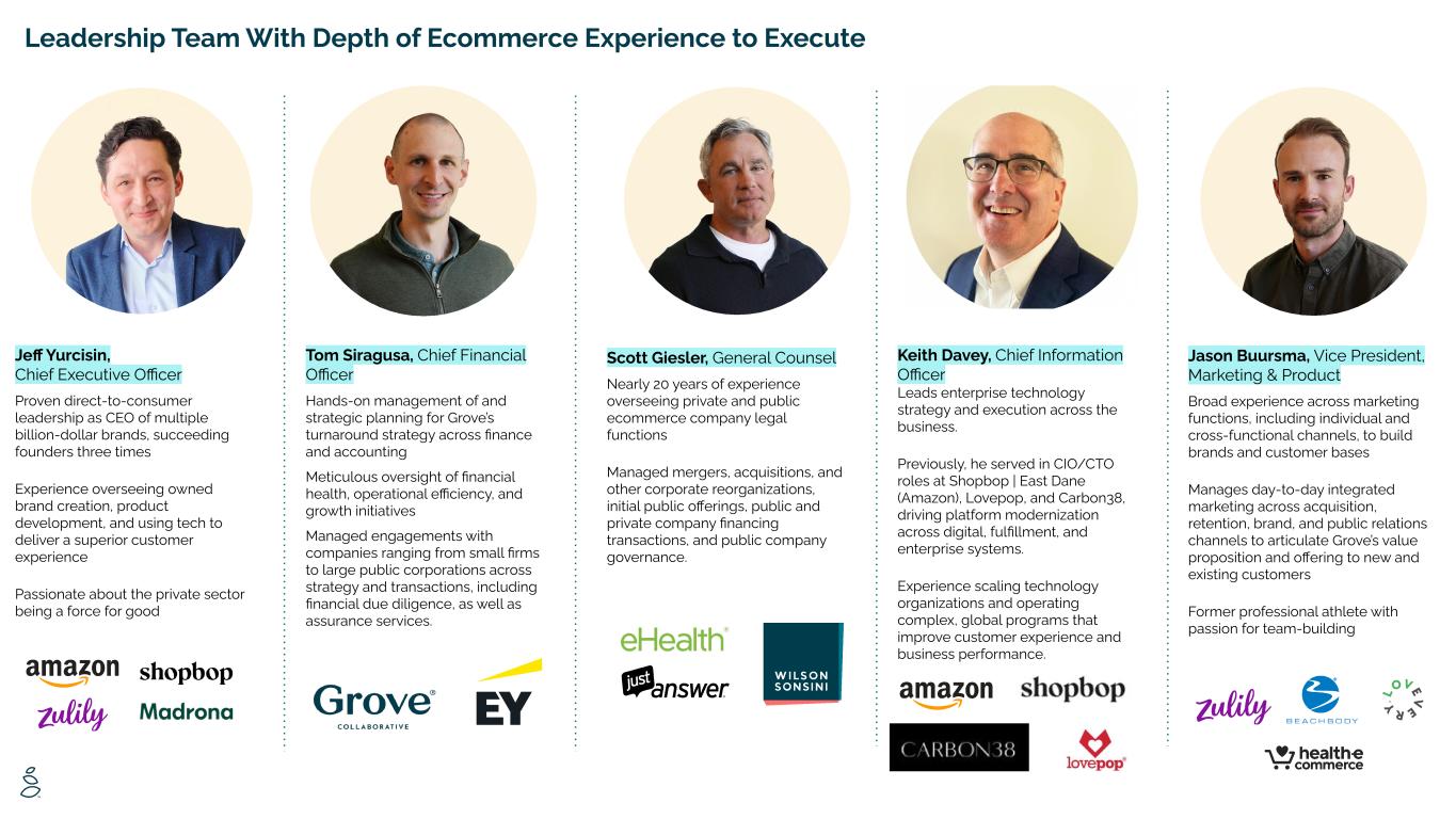 Leadership Team With Depth of Ecommerce Experience to Execute Tom Siragusa, Chief Financial Officer Hands-on management of and strategic planning for Grove’s turnaround strategy across finance and accounting Meticulous oversight of financial health, operational efficiency, and growth initiatives Managed engagements with companies ranging from small firms to large public corporations across strategy and transactions, including financial due diligence, as well as assurance services. Scott Giesler, General Counsel Nearly 20 years of experience overseeing private and public ecommerce company legal functions Managed mergers, acquisitions, and other corporate reorganizations, initial public offerings, public and private company financing transactions, and public company governance. Jason Buursma, Vice President, Marketing & Product Broad experience across marketing functions, including individual and cross-functional channels, to build brands and customer bases Manages day-to-day integrated marketing across acquisition, retention, brand, and public relations channels to articulate Grove’s value proposition and offering to new and existing customers Former professional athlete with passion for team-building Jeff Yurcisin, Chief Executive Officer Proven direct-to-consumer leadership as CEO of multiple billion-dollar brands, succeeding founders three times Experience overseeing owned brand creation, product development, and using tech to deliver a superior customer experience Passionate about the private sector being a force for good Keith Davey, Chief Information Officer Leads enterprise technology strategy and execution across the business. Previously, he served in CIO/CTO roles at Shopbop | East Dane (Amazon), Lovepop, and Carbon38, driving platform modernization across digital, fulfillment, and enterprise systems. Experience scaling technology organizations and operating complex, global programs that improve customer experience and business performance.