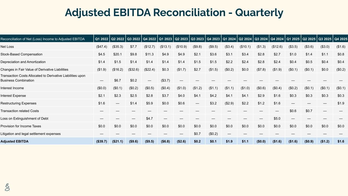 Adjusted EBITDA Reconciliation - Quarterly $MM (1) Reconciliation of Net (Loss) Income to Adjusted EBITDA Q1 2022 Q2 2022 Q3 2022 Q4 2022 Q1 2023 Q2 2023 Q3 2023 Q4 2023 Q1 2024 Q2 2024 Q3 2024 Q4 2024 Q1 2025 Q2 2025 Q3 2025 Q4 2025 Net Loss ($47.4) ($35.3) $7.7 ($12.7) ($13.1) ($10.9) ($9.8) ($9.5) ($3.4) ($10.1) ($1.3) ($12.6) ($3.5) ($3.6) ($3.0) ($1.6) Stock-Based Compensation $4.5 $20.1 $9.8 $11.3 $4.9 $4.9 $2.1 $3.6 $3.1 $3.4 $2.8 $2.7 $1.0 $1.4 $1.1 $0.8 Depreciation and Amortization $1.4 $1.5 $1.4 $1.4 $1.4 $1.4 $1.5 $1.5 $2.2 $2.4 $2.8 $2.4 $0.4 $0.5 $0.4 $0.4 Changes in Fair Value of Derivative Liabilities ($1.9) ($16.2) ($32.6) ($22.4) $0.3 ($1.7) $2.7 ($1.5) ($0.2) $0.0 ($7.8) ($1.9) ($0.1) ($0.1) $0.0 ($0.2) Transaction Costs Allocated to Derivative Liabilities upon Business Combination — $6.7 $0.2 — ($3.7) — — — — — — — — — — — Interest Income ($0.0) ($0.1) ($0.2) ($0.5) ($0.4) ($1.0) ($1.2) ($1.1) ($1.1) ($1.0) ($0.6) ($0.4) ($0.2) ($0.1) ($0.1) ($0.1) Interest Expense $2.1 $2.3 $2.5 $2.8 $3.7 $4.0 $4.1 $4.2 $4.1 $4.1 $2.9 $1.6 $0.3 $0.3 $0.3 $0.3 Restructuring Expenses $1.6 — $1.4 $5.9 $0.0 $0.6 — $3.2 ($2.9) $2.2 $1.2 $1.6 — — — $1.9 Transaction related Costs — — — — — — — — — — — — $0.6 $0.7 — — Loss on Extinguishment of Debt — — — $4.7 — — — — — — — $5.0 — — — — Provision for Income Taxes $0.0 $0.0 $0.0 $0.0 $0.0 $0.0 $0.0 $0.0 $0.0 $0.0 $0.0 $0.0 $0.0 $0.0 $0.0 $0.0 Litigation and legal settlement expenses — — — — — — $0.7 ($0.2) — — — — — — — — Adjusted EBITDA ($39.7) ($21.1) ($9.6) ($9.5) ($6.8) ($2.6) $0.2 $0.1 $1.9 $1.1 ($0.0) ($1.6) ($1.6) ($0.9) ($1.2) $1.6