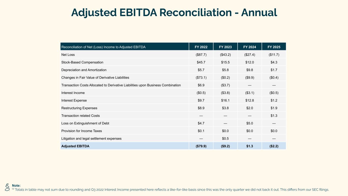 Adjusted EBITDA Reconciliation - Annual Note: (1) Totals in table may not sum due to rounding and Q3 2022 Interest Income presented here reflects a like-for-like basis since this was the only quarter we did not back it out. This differs from our SEC filings. Reconciliation of Net (Loss) Income to Adjusted EBITDA FY 2022 FY 2023 FY 2024 FY 2025 Net Loss ($87.7) ($43.2) ($27.4) ($11.7) Stock-Based Compensation $45.7 $15.5 $12.0 $4.3 Depreciation and Amortization $5.7 $5.8 $9.8 $1.7 Changes in Fair Value of Derivative Liabilities ($73.1) ($0.2) ($9.9) ($0.4) Transaction Costs Allocated to Derivative Liabilities upon Business Combination $6.9 ($3.7) — — Interest Income ($0.5) ($3.8) ($3.1) ($0.5) Interest Expense $9.7 $16.1 $12.8 $1.2 Restructuring Expenses $8.9 $3.8 $2.0 $1.9 Transaction related Costs — — — $1.3 Loss on Extinguishment of Debt $4.7 — $5.0 — Provision for Income Taxes $0.1 $0.0 $0.0 $0.0 Litigation and legal settlement expenses — $0.5 — — Adjusted EBITDA ($79.9) ($9.2) $1.3 ($2.2)