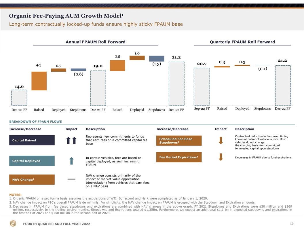FPAUM and Average Fee Rate Detail Robust organic FPAUM growth and stable, attractive fee rates 1 2 ORGANIC FPAUM GROWTH ($Bn) AVERAGE FEE RATE (Bps) 3 Average Q4’22 Actual Fee Rate : 115bps 17% CAGR Quarterly average fee rates show the basis points attributable 4 to base management fees and catch-up fees . For 2023, we 4 expect the average fee rate to be 105bps 115 21.2 106 19 103 99 14.6 14 11.3 112 99 104 97 4 3 2 2 2018PF 2019PF 2020PF 2021PF Q4'22 PF Q1’22 Q2’22 Q3’22 Q4’22 5 Organic FPAUM Growth Average FPAUM ($Bn) 24% 4% 30% 11% 17.4 18.0 18.7 20.1 NOTES: 1. Organic FPAUM is calculated on a pro forma basis assuming the acquisitions of WTI, Five Points, TrueBridge, Enhanced, Bonaccord, and Hark were completed as of January 1, 2018. 2. The average fee rates shown in the graph are calculated as actual average FPAUM as a quotient of actual revenue. 3. Average Q4’22PF fee rate was 110bps. 4. Catch-up fees are earned from investors that committed during the fundraising period of funds originally launched in prior periods, and as such, the investors are required to pay a catch- up fee as if they had committed to the fund at the first closing. While catch-up fees are not a significant component of our overall revenue stream, they may result in a temporary increase in our revenues in the period in which they are recognized. 5. Q4’22 organic FPAUM growth is the pro forma FPAUM growth from Q4’21 to Q4’22. Note: “PF” refers to calculations made on a pro forma basis. “A” refers to calculations made on an actual basis. 9 FOURTH QUARTER AND FULL YEAR 2022