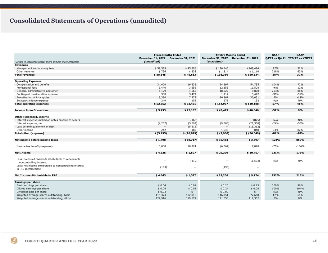 Consolidated Statements of Operations (unaudited) Three Months Ended Twelve Months Ended GAAP GAAP December 31, 2022 December 31, 2021 December 31, 2022 December 31, 2021 Q4'22 vs Q4'21 YTD'22 vs YTD'21 (unaudited)(unaudited) (Dollars in thousands except share and per share amounts) Revenues Management and advisory fees $ 57,589 $ 45,395 $ 196,546 $ 149,424 27% 32% Other revenue $ 756 $ 238 $ 1,814 $ 1,110 218% 63% Total revenues $ 58,345 $ 45,633 $ 198,360 $ 150,534 28% 32% Operating Expenses Compensation and benefits 34,004 1 6,636 9 4,297 5 4,755 104% 72% Professional fees 3 ,440 3 ,652 12,856 1 1,508 -6% 12% General, administrative and other 6 ,129 1 ,560 18,522 9 ,870 293% 88% Contingent consideration expense 350 3,472 1,717 3 ,472 -90% -51% Amortization of intangibles 8 ,380 7 ,979 26,867 3 0,431 5% -12% Strategic alliance expense 249 1 52 678 152 N/A N/A Total operating expenses $ 52,552 $ 33,451 $ 154,937 $ 110,188 57% 41% Income From Operations $ 5,793 $ 12,182 $ 43,423 $ 40,346 -52% 8% Other (Expense)/Income Interest expense implied on notes payable to sellers — ( 168) — ( 825) N/A N/A Interest expense, net (4,237) ( 5,599) (9,505) ( 21,360) -24% -56% Loss on extinguishment of debt — ( 15,312) — (15,312) Other income 242 1 80 1 ,545 848 34% 82% Total other (expense) $ (3,995) $ (20,899) $ (7,960) $ (36,649) -81% -78% Net income before income taxes $ 1,798 $ (8,717) $ 35,463 $ 3,697 -121% 859% Income tax benefit/(expense) 3 ,038 10,224 (6,064) 7 ,070 -70% -186% Net Income $ 4,836 $ 1,507 $ 29,399 $ 10,767 221% 173% Less: preferred dividends attributable to redeemable — ( 110) — (1,593) N/A N/A noncontrolling interest Less: net income attributable to noncontrolling interest ( 193) — (193) — in P10 Intermediate Net Income Attributable to P10 $ 4,643 $ 1,397 $ 29,206 $ 9,174 232% 218% Earnings per share Basic earnings per share $ 0.04 $ 0.01 $ 0.25 $ 0.13 300% 98% Diluted earnings per share $ 0.04 $ 0.02 $ 0.24 $ 0.08 100% 194% Dividends paid per share $ 0.03 $ — $ 0.09 $ — N/A N/A Weighted average shares outstanding, basic 115,373 102,916 1 16,751 7 2,660 12% 61% Weighted average shares outstanding, diluted 122,916 119,571 1 21,655 112,332 3% 8% 15 FOURTH QUARTER AND FULL YEAR 2022
