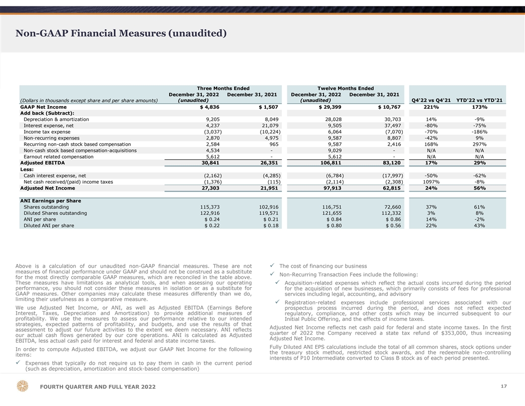 Non-GAAP Financial Measures (unaudited) Three Months Ended Twelve Months Ended December 31, 2022 December 31, 2021 December 31, 2022 December 31, 2021 (Dollars in thousands except share and per share amounts)(unaudited)(unaudited) Q4'22 vs Q4'21 YTD'22 vs YTD'21 GAAP Net Income $ 4,836 $ 1,507 $ 29,399 $ 10,767 221% 173% Add back (Subtract): Depreciation & amortization 9,205 8,049 28,028 30,703 14% -9% Interest expense, net 4,237 21,079 9,505 37,497 -80% -75% Income tax expense (3,037) (10,224) 6,064 (7,070) -70% -186% Non-recurring expenses 2,870 4,975 9,587 8,807 -42% 9% Recurring non-cash stock based compensation 2,584 965 9,587 2,416 168% 297% Non-cash stock based compensation-acquisitions 4,534 - 9,029 - N/A N/A Earnout related compensation 5,612 - 5,612 - N/A N/A Adjusted EBITDA 30,841 26,351 106,811 83,120 17% 29% Less: Cash interest expense, net (2,162) ( 4,285) (6,784) (17,997) -50% -62% Net cash received/(paid) income taxes (1,376) (115) (2,114) (2,308) 1097% -8% Adjusted Net Income 27,303 21,951 97,913 62,815 24% 56% ANI Earnings per Share Shares outstanding 115,373 102,916 116,751 72,660 37% 61% Diluted Shares outstanding 122,916 119,571 121,655 112,332 3% 8% ANI per share $ 0.24 $ 0.21 $ 0.84 $ 0.86 14% -2% Diluted ANI per share $ 0.22 $ 0.18 $ 0.80 $ 0.56 22% 43% Above is a calculation of our unaudited non-GAAP financial measures. These are notü The cost of financing our business measures of financial performance under GAAP and should not be construed as a substitute ü Non-Recurring Transaction Fees include the following: for the most directly comparable GAAP measures, which are reconciled in the table above. These measures have limitations as analytical tools, and when assessing our operating Acquisition-related expenses which reflect the actual costs incurred during the period ü performance, you should not consider these measures in isolation or as a substitute for for the acquisition of new businesses, which primarily consists of fees for professional GAAP measures. Other companies may calculate these measures differently than we do, services including legal, accounting, and advisory limiting their usefulness as a comparative measure. ü Registration-related expenses include professional services associated with our We use Adjusted Net Income, or ANI, as well as Adjusted EBITDA (Earnings Before prospectus process incurred during the period, and does not reflect expected Interest, Taxes, Depreciation and Amortization) to provide additional measures of regulatory, compliance, and other costs which may be incurred subsequent to our profitability. We use the measures to assess our performance relative to our intended Initial Public Offering, and the effects of income taxes. strategies, expected patterns of profitability, and budgets, and use the results of that Adjusted Net Income reflects net cash paid for federal and state income taxes. In the first assessment to adjust our future activities to the extent we deem necessary. ANI reflects quarter of 2022 the Company received a state tax refund of $353,000, thus increasing our actual cash flows generated by our core operations. ANI is calculated as Adjusted Adjusted Net Income. EBITDA, less actual cash paid for interest and federal and state income taxes. Fully Diluted ANI EPS calculations include the total of all common shares, stock options under In order to compute Adjusted EBITDA, we adjust our GAAP Net Income for the following the treasury stock method, restricted stock awards, and the redeemable non-controlling items: interests of P10 Intermediate converted to Class B stock as of each period presented. ü Expenses that typically do not require us to pay them in cash in the current period (such as depreciation, amortization and stock-based compensation) 17 FOURTH QUARTER AND FULL YEAR 2022
