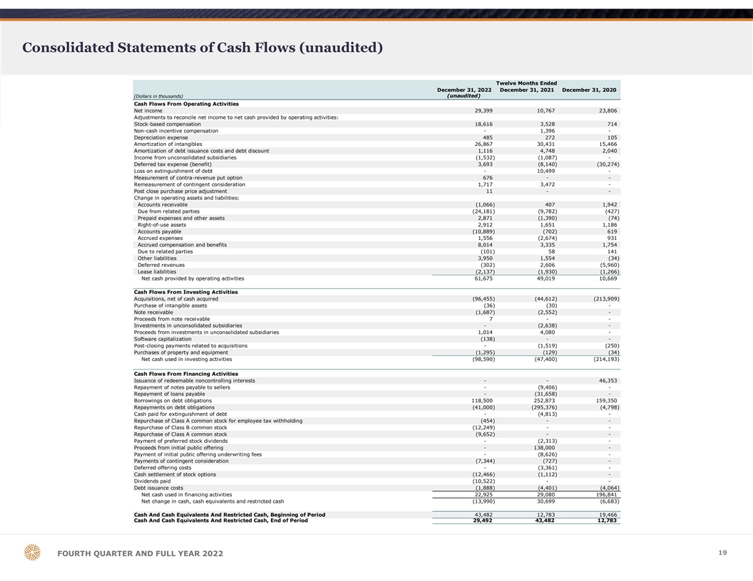 Consolidated Statements of Cash Flows (unaudited) Twelve Months Ended December 31, 2022 December 31, 2021 December 31, 2020 (Dollars in thousands)(unaudited) Cash Flows From Operating Activities Net income 29,399 10,767 23,806 Adjustments to reconcile net income to net cash provided by operating activities: Stock-based compensation 18,616 3,528 714 Non-cash incentive compensation - 1,396 - Depreciation expense 4 85 272 105 Amortization of intangibles 26,867 30,431 15,466 Amortization of debt issuance costs and debt discount 1,116 4,748 2,040 Income from unconsolidated subsidiaries (1,532) (1,087) - Deferred tax expense (benefit) 3,693 (8,140) (30,274) Loss on extinguishment of debt - 10,499 - Measurement of contra-revenue put option 6 76 - - Remeasurement of contingent consideration 1,717 3,472 - Post close purchase price adjustment 11 - - Change in operating assets and liabilities: Accounts receivable (1,066) 407 1,942 Due from related parties ( 24,181) (9,782) (427) Prepaid expenses and other assets 2,871 (1,390) (74) Right-of-use assets 2,912 1,651 1,186 Accounts payable ( 10,889) (702) 619 Accrued expenses 1,556 (2,674) 931 Accrued compensation and benefits 8,014 3,335 1,754 Due to related parties (101) 58 141 Other liabilities 3,950 1,554 (34) Deferred revenues (302) 2,606 (5,960) Lease liabilities (2,137) (1,930) (1,266) Net cash provided by operating activities 61,675 49,019 10,669 Cash Flows From Investing Activities Acquisitions, net of cash acquired ( 96,455) (44,612) (213,909) Purchase of intangible assets (36) (30) - Note receivable (1,687) (2,552) - Proceeds from note receivable 7 - - Investments in unconsolidated subsidiaries - (2,638) - Proceeds from investments in unconsolidated subsidiaries 1,014 4,080 - Software capitalization (138) - - Post-closing payments related to acquisitions - (1,519) (250) Purchases of property and equipment (1,295) (129) (34) Net cash used in investing activities ( 98,590) (47,400) (214,193) Cash Flows From Financing Activities Issuance of redeemable noncontrolling interests - - 46,353 Repayment of notes payable to sellers - (9,406) - Repayment of loans payable - (31,658) - Borrowings on debt obligations 118,500 252,873 159,350 Repayments on debt obligations ( 41,000) (295,376) (4,798) Cash paid for extinguishment of debt - (4,813) - Repurchase of Class A common stock for employee tax withholding (454) - - Repurchase of Class B common stock ( 12,249) - - Repurchase of Class A common stock (9,652) - - Payment of preferred stock dividends - (2,313) - Proceeds from initial public offering - 138,000 - Payment of initial public offering underwriting fees - (8,626) - Payments of contingent consideration (7,344) (727) - Deferred offering costs - (3,361) - Cash settlement of stock options ( 12,466) (1,112) - Dividends paid ( 10,522) - - Debt issuance costs (1,888) (4,401) (4,064) Net cash used in financing activities 22,925 29,080 196,841 Net change in cash, cash equivalents and restricted cash ( 13,990) 30,699 (6,683) Cash And Cash Equivalents And Restricted Cash, Beginning of Period 43,482 12,783 19,466 Cash And Cash Equivalents And Restricted Cash, End of Period 2 9,492 43,482 12,783 19 FOURTH QUARTER AND FULL YEAR 2022