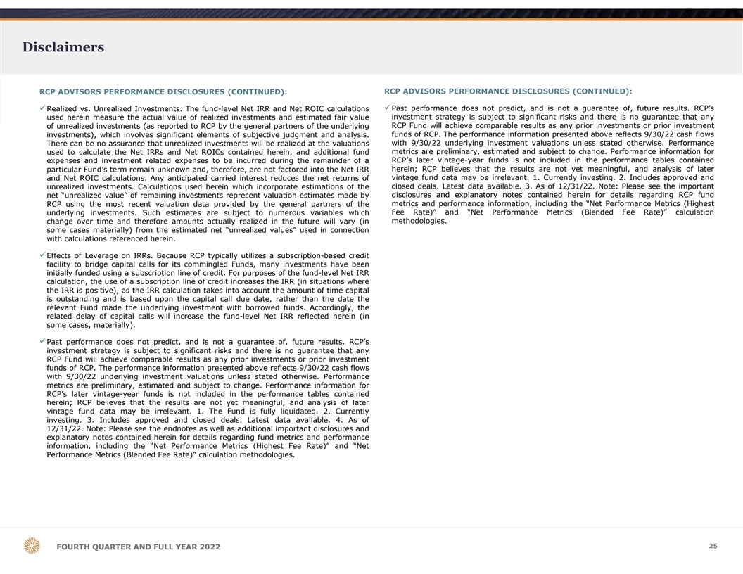 Disclaimers RCP ADVISORS PERFORMANCE DISCLOSURES (CONTINUED): RCP ADVISORS PERFORMANCE DISCLOSURES (CONTINUED): üPast performance does not predict, and is not a guarantee of, future results. RCP’s üRealized vs. Unrealized Investments. The fund-level Net IRR and Net ROIC calculations investment strategy is subject to significant risks and there is no guarantee that any used herein measure the actual value of realized investments and estimated fair value of unrealized investments (as reported to RCP by the general partners of the underlying RCP Fund will achieve comparable results as any prior investments or prior investment funds of RCP. The performance information presented above reflects 9/30/22 cash flows investments), which involves significant elements of subjective judgment and analysis. with 9/30/22 underlying investment valuations unless stated otherwise. Performance There can be no assurance that unrealized investments will be realized at the valuations metrics are preliminary, estimated and subject to change. Performance information for used to calculate the Net IRRs and Net ROICs contained herein, and additional fund expenses and investment related expenses to be incurred during the remainder of a RCP’s later vintage-year funds is not included in the performance tables contained particular Fund’s term remain unknown and, therefore, are not factored into the Net IRR herein; RCP believes that the results are not yet meaningful, and analysis of later vintage fund data may be irrelevant. 1. Currently investing. 2. Includes approved and and Net ROIC calculations. Any anticipated carried interest reduces the net returns of closed deals. Latest data available. 3. As of 12/31/22. Note: Please see the important unrealized investments. Calculations used herein which incorporate estimations of the net “unrealized value” of remaining investments represent valuation estimates made by disclosures and explanatory notes contained herein for details regarding RCP fund RCP using the most recent valuation data provided by the general partners of the metrics and performance information, including the “Net Performance Metrics (Highest Fee Rate)” and “Net Performance Metrics (Blended Fee Rate)” calculation underlying investments. Such estimates are subject to numerous variables which methodologies. change over time and therefore amounts actually realized in the future will vary (in some cases materially) from the estimated net “unrealized values” used in connection with calculations referenced herein. üEffects of Leverage on IRRs. Because RCP typically utilizes a subscription-based credit facility to bridge capital calls for its commingled Funds, many investments have been initially funded using a subscription line of credit. For purposes of the fund-level Net IRR calculation, the use of a subscription line of credit increases the IRR (in situations where the IRR is positive), as the IRR calculation takes into account the amount of time capital is outstanding and is based upon the capital call due date, rather than the date the relevant Fund made the underlying investment with borrowed funds. Accordingly, the related delay of capital calls will increase the fund-level Net IRR reflected herein (in some cases, materially). üPast performance does not predict, and is not a guarantee of, future results. RCP’s investment strategy is subject to significant risks and there is no guarantee that any RCP Fund will achieve comparable results as any prior investments or prior investment funds of RCP. The performance information presented above reflects 9/30/22 cash flows with 9/30/22 underlying investment valuations unless stated otherwise. Performance metrics are preliminary, estimated and subject to change. Performance information for RCP’s later vintage-year funds is not included in the performance tables contained herein; RCP believes that the results are not yet meaningful, and analysis of later vintage fund data may be irrelevant. 1. The Fund is fully liquidated. 2. Currently investing. 3. Includes approved and closed deals. Latest data available. 4. As of 12/31/22. Note: Please see the endnotes as well as additional important disclosures and explanatory notes contained herein for details regarding fund metrics and performance information, including the “Net Performance Metrics (Highest Fee Rate)” and “Net Performance Metrics (Blended Fee Rate)” calculation methodologies. 2 25 5 F FO OU UR RT TH H Q QU UA AR RT TE ER R A AN ND D F FU UL LL L Y YE EA AR R 2 20 02 22 2