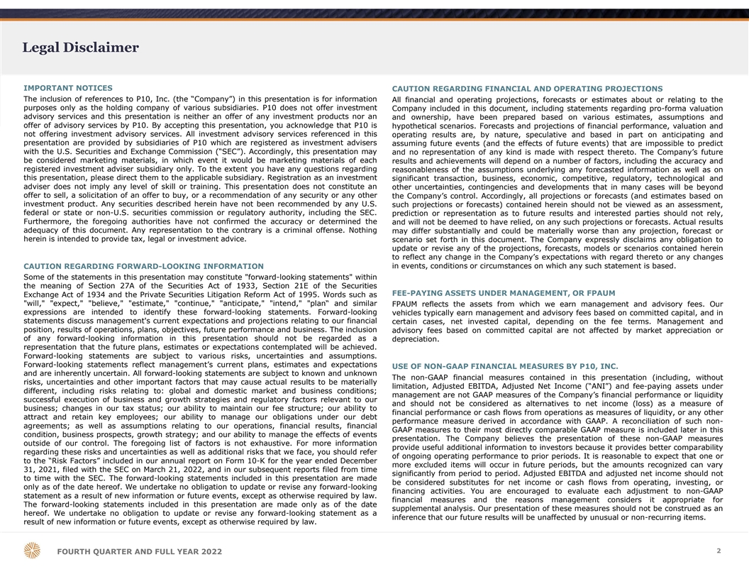 Legal Disclaimer IMPORTANT NOTICES CAUTION REGARDING FINANCIAL AND OPERATING PROJECTIONS The inclusion of references to P10, Inc. (the “Company”) in this presentation is for information All financial and operating projections, forecasts or estimates about or relating to the purposes only as the holding company of various subsidiaries. P10 does not offer investment Company included in this document, including statements regarding pro-forma valuation advisory services and this presentation is neither an offer of any investment products nor an and ownership, have been prepared based on various estimates, assumptions and offer of advisory services by P10. By accepting this presentation, you acknowledge that P10 is hypothetical scenarios. Forecasts and projections of financial performance, valuation and not offering investment advisory services. All investment advisory services referenced in this operating results are, by nature, speculative and based in part on anticipating and presentation are provided by subsidiaries of P10 which are registered as investment advisers assuming future events (and the effects of future events) that are impossible to predict with the U.S. Securities and Exchange Commission (“SEC”). Accordingly, this presentation may and no representation of any kind is made with respect thereto. The Company’s future be considered marketing materials, in which event it would be marketing materials of each results and achievements will depend on a number of factors, including the accuracy and registered investment adviser subsidiary only. To the extent you have any questions regarding reasonableness of the assumptions underlying any forecasted information as well as on this presentation, please direct them to the applicable subsidiary. Registration as an investment significant transaction, business, economic, competitive, regulatory, technological and adviser does not imply any level of skill or training. This presentation does not constitute an other uncertainties, contingencies and developments that in many cases will be beyond offer to sell, a solicitation of an offer to buy, or a recommendation of any security or any other the Company’s control. Accordingly, all projections or forecasts (and estimates based on investment product. Any securities described herein have not been recommended by any U.S. such projections or forecasts) contained herein should not be viewed as an assessment, federal or state or non-U.S. securities commission or regulatory authority, including the SEC. prediction or representation as to future results and interested parties should not rely, Furthermore, the foregoing authorities have not confirmed the accuracy or determined the and will not be deemed to have relied, on any such projections or forecasts. Actual results adequacy of this document. Any representation to the contrary is a criminal offense. Nothing may differ substantially and could be materially worse than any projection, forecast or herein is intended to provide tax, legal or investment advice. scenario set forth in this document. The Company expressly disclaims any obligation to update or revise any of the projections, forecasts, models or scenarios contained herein to reflect any change in the Company’s expectations with regard thereto or any changes CAUTION REGARDING FORWARD-LOOKING INFORMATION in events, conditions or circumstances on which any such statement is based. Some of the statements in this presentation may constitute forward-looking statements within the meaning of Section 27A of the Securities Act of 1933, Section 21E of the Securities FEE-PAYING ASSETS UNDER MANAGEMENT, OR FPAUM Exchange Act of 1934 and the Private Securities Litigation Reform Act of 1995. Words such as will, expect, believe, estimate, continue, anticipate, intend, plan“ and similar FPAUM reflects the assets from which we earn management and advisory fees. Our expressions are intended to identify these forward-looking statements. Forward-looking vehicles typically earn management and advisory fees based on committed capital, and in statements discuss management's current expectations and projections relating to our financial certain cases, net invested capital, depending on the fee terms. Management and position, results of operations, plans, objectives, future performance and business. The inclusion advisory fees based on committed capital are not affected by market appreciation or of any forward-looking information in this presentation should not be regarded as a depreciation. representation that the future plans, estimates or expectations contemplated will be achieved. Forward-looking statements are subject to various risks, uncertainties and assumptions. Forward-looking statements reflect management’s current plans, estimates and expectations USE OF NON-GAAP FINANCIAL MEASURES BY P10, INC. and are inherently uncertain. All forward-looking statements are subject to known and unknown The non-GAAP financial measures contained in this presentation (including, without risks, uncertainties and other important factors that may cause actual results to be materially limitation, Adjusted EBITDA, Adjusted Net Income (“ANI”) and fee-paying assets under different, including risks relating to: global and domestic market and business conditions; management are not GAAP measures of the Company’s financial performance or liquidity successful execution of business and growth strategies and regulatory factors relevant to our and should not be considered as alternatives to net income (loss) as a measure of business; changes in our tax status; our ability to maintain our fee structure; our ability to financial performance or cash flows from operations as measures of liquidity, or any other attract and retain key employees; our ability to manage our obligations under our debt performance measure derived in accordance with GAAP. A reconciliation of such non- agreements; as well as assumptions relatin