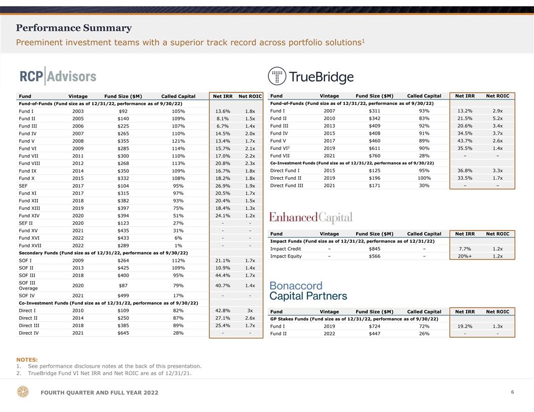 Performance Summary 1 Preeminent investment teams with a superior track record across portfolio solutions Fund Vintage Fund Size ($M) Called Capital Net IRR Net ROIC Fund Vintage Fund Size ($M) Called Capital Net IRR Net ROIC Fund-of-Funds (Fund size as of 12/31/22, performance as of 9/30/22) Fund-of-Funds (Fund size as of 12/31/22, performance as of 9/30/22) Fund I 2007 $311 93% 13.2% 2.9x Fund I 2003 $92 105% 13.6% 1.8x Fund II 2010 $342 83% 21.5% 5.2x Fund II 2005 $140 109% 8.1% 1.5x Fund III 2006 $225 107% 6.7% 1.4x Fund III 2013 $409 92% 20.6% 3.4x Fund IV 2007 $265 110% 14.5% 2.0x Fund IV 2015 $408 91% 34.5% 3.7x Fund V 2008 $355 121% 13.4% 1.7x Fund V 2017 $460 89% 43.7% 2.6x 2 Fund VI 2009 $285 114% 15.7% 2.1x Fund VI 2019 $611 90% 35.5% 1.4x Fund VII 2011 $300 110% 17.0% 2.2x Fund VII 2021 $760 28% – – Co-Investment Funds (Fund size as of 12/31/22, performance as of 9/30/22) Fund VIII 2012 $268 113% 20.8% 2.3x Fund IX 2014 $350 109% 16.7% 1.8x Direct Fund I 2015 $125 95% 36.8% 3.3x Direct Fund II 2019 $196 100% 33.5% 1.7x Fund X 2015 $332 108% 18.2% 1.8x Direct Fund III 2021 $171 30% – – SEF 2017 $104 95% 26.9% 1.9x Fund XI 2017 $315 97% 20.5% 1.7x Fund XII 2018 $382 93% 20.4% 1.5x Fund XIII 2019 $397 75% 18.4% 1.3x Fund XIV 2020 $394 51% 24.1% 1.2x SEF II 2020 $123 27% - - Fund XV 2021 $435 31% - - Fund Vintage Fund Size ($M) Called Capital Net IRR Net ROIC Fund XVI 2022 $433 6% - - Impact Funds (Fund size as of 12/31/22, performance as of 12/31/22) Fund XVII 2022 $289 1% - - Impact Credit – $845 – 7.7% 1.2x Secondary Funds (Fund size as of 12/31/22, performance as of 9/30/22) Impact Equity – $566 – 20%+ 1.2x SOF I 2009 $264 112% 21.1% 1.7x SOF II 2013 $425 109% 10.9% 1.4x SOF III 2018 $400 95% 44.4% 1.7x SOF III 2020 $87 79% 40.7% 1.4x Overage SOF IV 2021 $499 17% - - Co-Investment Funds (Fund size as of 12/31/22, performance as of 9/30/22) Direct I 2010 $109 82% 42.8% 3x Fund Vintage Fund Size ($M) Called Capital Net IRR Net ROIC Direct II 2014 $250 87% 27.1% 2.6x GP Stakes Funds (Fund size as of 12/31/22, performance as of 9/30/22) Direct III 2018 $385 89% 25.4% 1.7x Fund I 2019 $724 72% 19.2% 1.3x Direct IV 2021 $645 28% - - Fund II 2022 $447 26% - - NOTES: 1. See performance disclosure notes at the back of this presentation. 2. TrueBridge Fund VI Net IRR and Net ROIC are as of 12/31/21. 6 FOURTH QUARTER AND FULL YEAR 2022