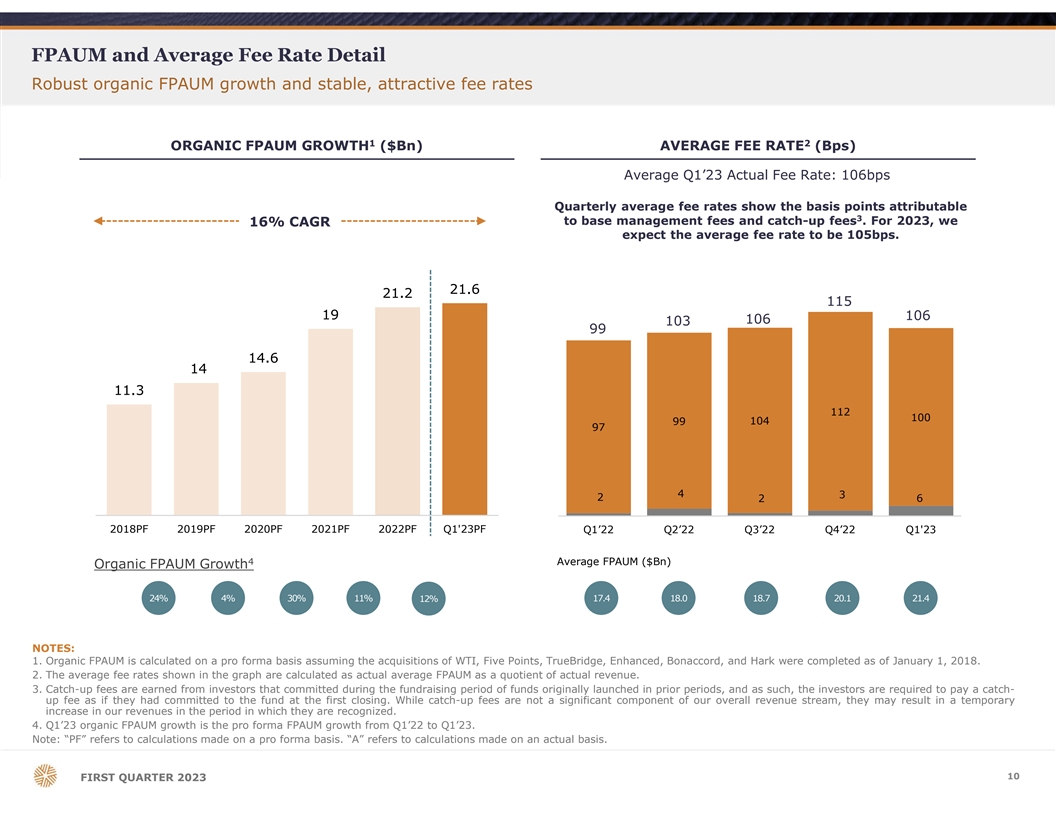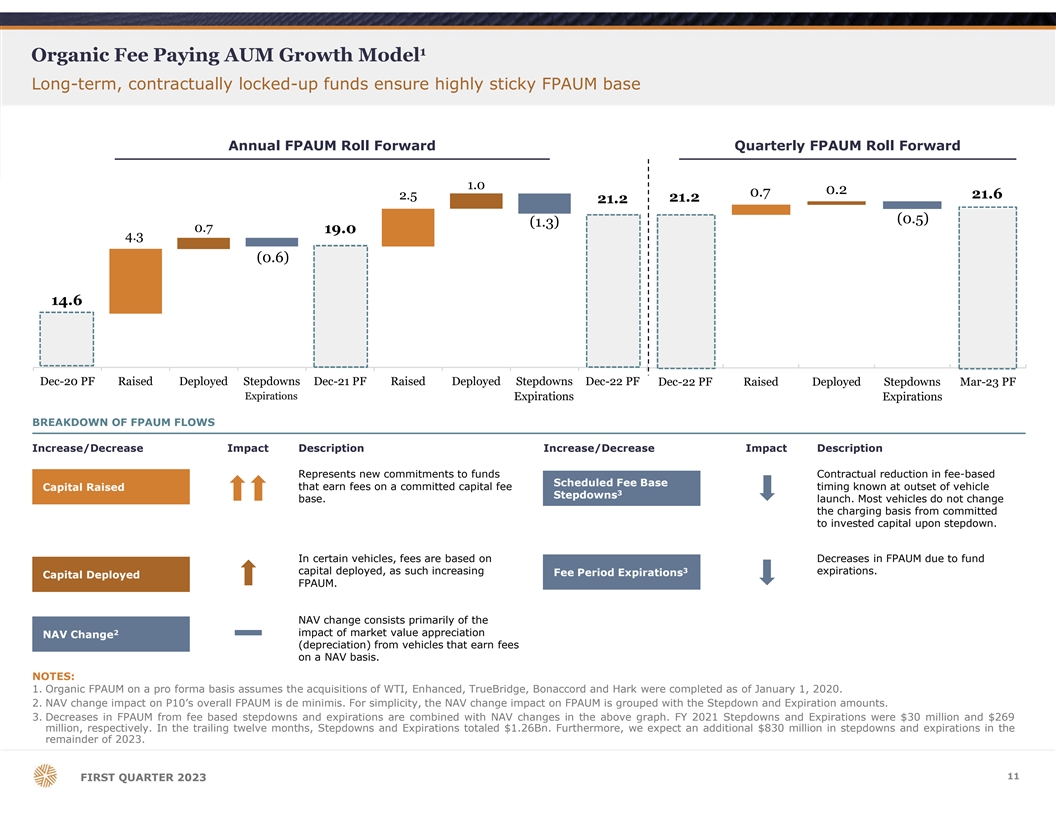 FPAUM and Average Fee Rate Detail Robust organic FPAUM growth and stable, attractive fee rates 1 2 ORGANIC FPAUM GROWTH ($Bn) AVERAGE FEE RATE (Bps) Average Q1’23 Actual Fee Rate: 106bps Quarterly average fee rates show the basis points attributable 3 to base management fees and catch-up fees . For 2023, we 16% CAGR expect the average fee rate to be 105bps. 21.6 21.2 115 19 106 106 103 99 14.6 14 11.3 112 100 99 104 97 4 3 2 2 6 2018PF 2019PF 2020PF 2021PF 2022PF Q1'23PF Q1’22 Q2’22 Q3’22 Q4’22 Q1'23 4 Average FPAUM ($Bn) Organic FPAUM Growth 24% 4% 30% 11% 17.4 18.0 18.7 20.1 21.4 12% NOTES: 1. Organic FPAUM is calculated on a pro forma basis assuming the acquisitions of WTI, Five Points, TrueBridge, Enhanced, Bonaccord, and Hark were completed as of January 1, 2018. 2. The average fee rates shown in the graph are calculated as actual average FPAUM as a quotient of actual revenue. 3. Catch-up fees are earned from investors that committed during the fundraising period of funds originally launched in prior periods, and as such, the investors are required to pay a catch- up fee as if they had committed to the fund at the first closing. While catch-up fees are not a significant component of our overall revenue stream, they may result in a temporary increase in our revenues in the period in which they are recognized. 4. Q1’23 organic FPAUM growth is the pro forma FPAUM growth from Q1’22 to Q1’23. Note: “PF” refers to calculations made on a pro forma basis. “A” refers to calculations made on an actual basis. 10 FIRST QUARTER 2023