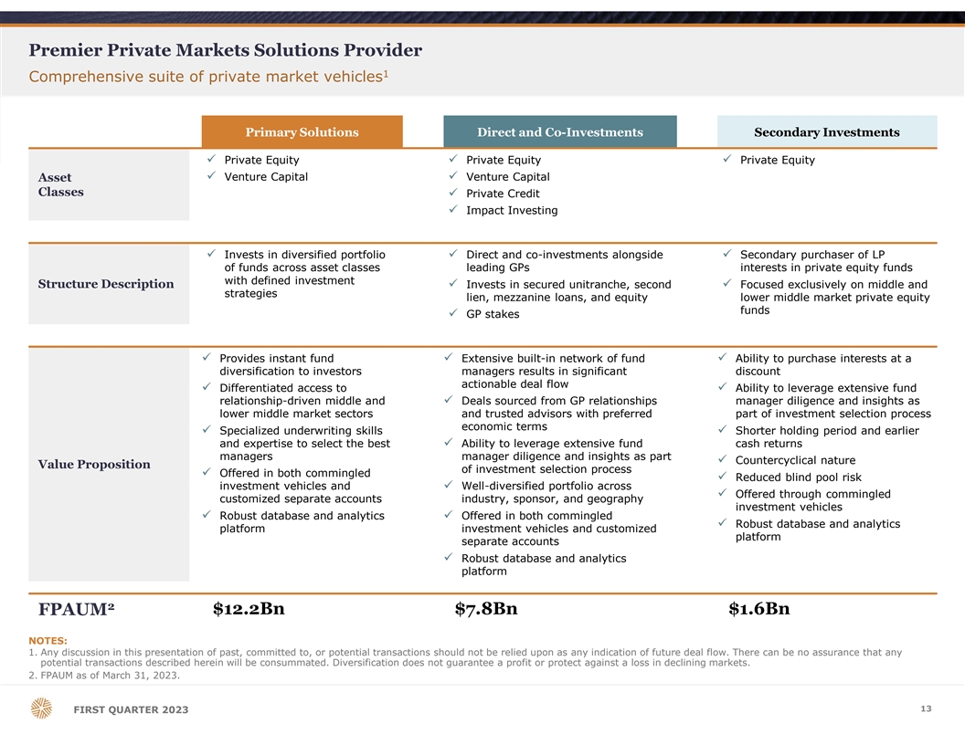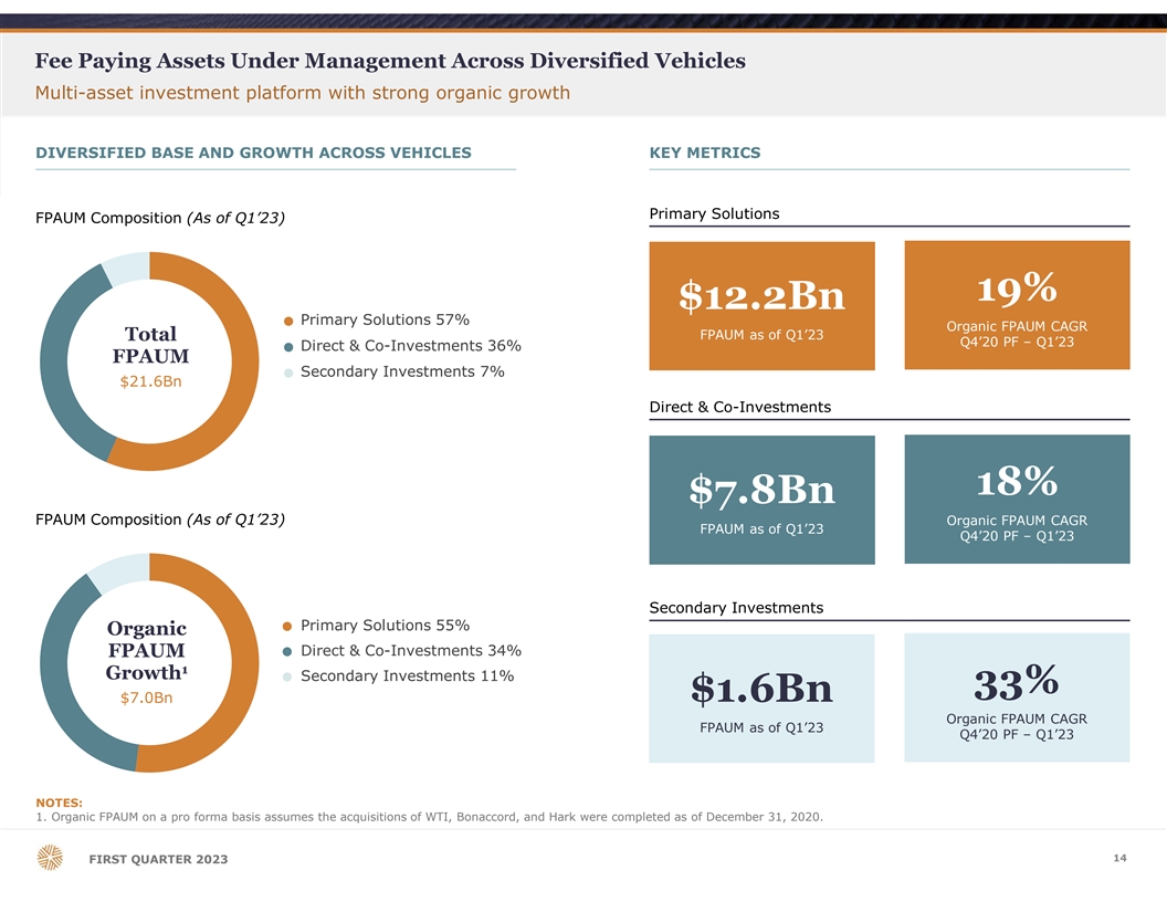 Premier Private Markets Solutions Provider 1 Comprehensive suite of private market vehicles Primary Solutions Direct and Co-Investments Secondary Investments ü Private Equityü Private Equityü Private Equity ü Venture Capitalü Venture Capital Asset Classes ü Private Credit ü Impact Investing ü Invests in diversified portfolio ü Direct and co-investments alongside ü Secondary purchaser of LP of funds across asset classes leading GPs interests in private equity funds with defined investment Structure Descriptionü Invests in secured unitranche, second ü Focused exclusively on middle and strategies lien, mezzanine loans, and equity lower middle market private equity funds ü GP stakes ü Provides instant fund ü Extensive built-in network of fund ü Ability to purchase interests at a diversification to investors managers results in significant discount actionable deal flow ü Differentiated access to ü Ability to leverage extensive fund relationship-driven middle and ü Deals sourced from GP relationships manager diligence and insights as lower middle market sectors and trusted advisors with preferred part of investment selection process economic terms ü Specialized underwriting skills ü Shorter holding period and earlier and expertise to select the best ü Ability to leverage extensive fund cash returns managers manager diligence and insights as part ü Countercyclical nature Value Proposition of investment selection process ü Offered in both commingled ü Reduced blind pool risk investment vehicles and ü Well-diversified portfolio across ü Offered through commingled customized separate accounts industry, sponsor, and geography investment vehicles ü Robust database and analytics ü Offered in both commingled ü Robust database and analytics platform investment vehicles and customized platform separate accounts ü Robust database and analytics platform 2 $12.2Bn $7.8Bn $1.6Bn FPAUM NOTES: 1. Any discussion in this presentation of past, committed to, or potential transactions should not be relied upon as any indication of future deal flow. There can be no assurance that any potential transactions described herein will be consummated. Diversification does not guarantee a profit or protect against a loss in declining markets. 2. FPAUM as of March 31, 2023. 13 FIRST QUARTER 2023