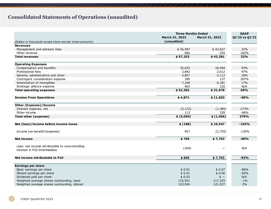 Consolidated Statements of Operations (unaudited) Three Months Ended GAAP March 31, 2023 March 31, 2022 Q1'23 vs Q1'22 (unaudited) (Dollars in thousands except share and per share amounts) Revenues Management and advisory fees $ 56,587 $ 43,027 32% Other revenue 666 2 54 162% Total revenues $ 57,253 $ 43,281 32% Operating Expenses Compensation and benefits 3 5,642 1 8,494 93% Professional fees 3,842 2 ,612 47% General, administrative and other 4,857 4 ,112 18% Contingent consideration expense 390 1 27 207% Amortization of intangibles 7,248 6 ,181 17% Strategic alliance expense 403 1 52 N/A Total operating expenses $ 52,382 $ 31,678 65% Income From Operations $ 4,871 $ 11,603 -58% Other (Expense)/Income Interest expense, net (5,172) (1,385) 273% Other income 113 3 29 -66% Total other (expense) $ (5,059) $ (1,056) 379% Net (loss)/income before income taxes $ (188) $ 10,547 -102% Income tax benefit/(expense) 957 (2,755) -135% Net income $ 769 $ 7,792 -90% Less: net income attributable to noncontrolling ( 164) — N/A interest in P10 Intermediate Net income attributable to P10 $ 605 $ 7,792 -92% Earnings per share Basic earnings per share $ 0.01 $ 0.07 -86% Diluted earnings per share $ 0.01 $ 0.06 -83% Dividends paid per share $ 0.03 $ — N/A Weighted average shares outstanding, basic 115,921 1 17,193 -1% Weighted average shares outstanding, diluted 123,926 1 21,537 2% 16 FIRST QUARTER 2023