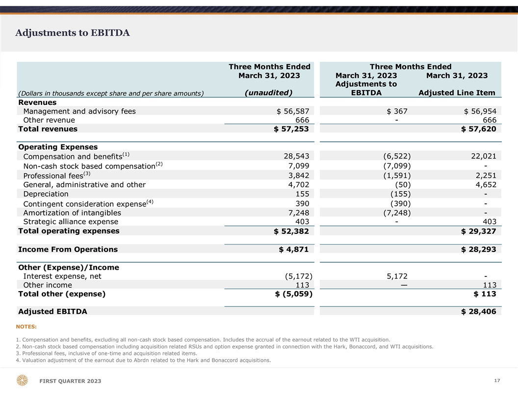Adjustments to EBITDA Three Months Ended Three Months Ended March 31, 2023 March 31, 2023 March 31, 2023 Adjustments to (unaudited) EBITDA Adjusted Line Item (Dollars in thousands except share and per share amounts) Revenues Management and advisory fees $ 56,587 $ 367 $ 56,954 Other revenue 6 66 - 666 Total revenues $ 57,253 $ 57,620 Operating Expenses (1) 2 8,543 ( 6,522) 2 2,021 Compensation and benefits (2) Non-cash stock based compensation 7,099 (7,099) - (3) Professional fees 3,842 (1,591) 2,251 General, administrative and other 4 ,702 (50) 4,652 Depreciation 1 55 ( 155) - (4) Contingent consideration expense 3 90 ( 390) - Amortization of intangibles 7 ,248 (7,248) - Strategic alliance expense 4 03 - 403 Total operating expenses $ 52,382 $ 29,327 Income From Operations $ 4,871 $ 28,293 Other (Expense)/Income Interest expense, net ( 5,172) 5,172 - Other income 1 13 — 1 13 Total other (expense) $ (5,059) $ 113 Adjusted EBITDA $ 28,406 NOTES: 1. Compensation and benefits, excluding all non-cash stock based compensation. Includes the accrual of the earnout related to the WTI acquisition. 2. Non-cash stock based compensation including acquisition related RSUs and option expense granted in connection with the Hark, Bonaccord, and WTI acquisitions. 3. Professional fees, inclusive of one-time and acquisition related items. 4. Valuation adjustment of the earnout due to Abrdn related to the Hark and Bonaccord acquisitions. 17 FIRST QUARTER 2023