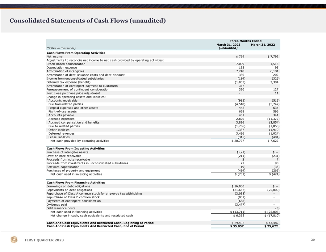 Consolidated Balance Sheets (unaudited) March 31, 2023 December 31, 2022 (unaudited) (Dollars in thousands except share amounts) Assets Cash and cash equivalents $ 25,050 $ 20,021 Restricted cash 10,807 9,471 Accounts receivable 17,466 16,551 Note receivable 4,440 4,231 Due from related parties 41,056 36,538 Investment in unconsolidated subsidiaries 2,413 2,321 Prepaid expenses and other assets 4,647 5,089 Property and equipment, net 3,207 2,878 Right-of-use assets 18,740 15,923 Contingent payments to customers 13,262 13,629 Deferred tax assets, net 42,328 41,275 Intangibles, net 1 44,577 151,795 Goodwill 5 06,638 506,638 Total assets $ 834,631 $ 826,360 Liabilities And Stockholders' Equity Liabilities Accounts payable $ 3,039 $ 2,578 Accrued expenses 11,002 8,052 Accrued compensation and benefits 26,643 18,900 Due to related parties 391 2,157 Other liabilities 10,051 8,715 Contingent consideration 17,039 17,337 Accrued contingent liability 14,305 14,305 Deferred revenues 16,137 12,651 Lease liabilities 21,718 18,558 Debt obligations 2 83,897 289,224 Total liabilities $ 404,222 $ 392,477 Stockholders' Equity Class A common stock, $0.001 par value; 510,000,000 shares authorized; 44,026,736 issued and 43,088,962 outstanding as of March 31, 2023, and 43,303,040 issued and 42,365,266 outstanding as of $ 43 $ 42 December 31, 2022, respectively Class B common stock, $0.001 par value; 180,000,000 shares authorized; 72,955,140 shares issued and 72,831,689 shares outstanding as of March 31, 2023, and 73,131,826 shares issued and 73,008,374 shares 7 3 73 outstanding as of December 31, 2022, respectively Treasury stock (9,926) (9,926) Additional paid-in-capital 624,706 628,828 Accumulated deficit (225,274) ( 225,879) Noncontrolling interest 40,787 40,745 Total stockholders' equity $ 430,409 $ 433,883 Total Liabilities And Stockholders' Equity $ 834,631 $ 826,360 19 FIRST QUARTER 2023