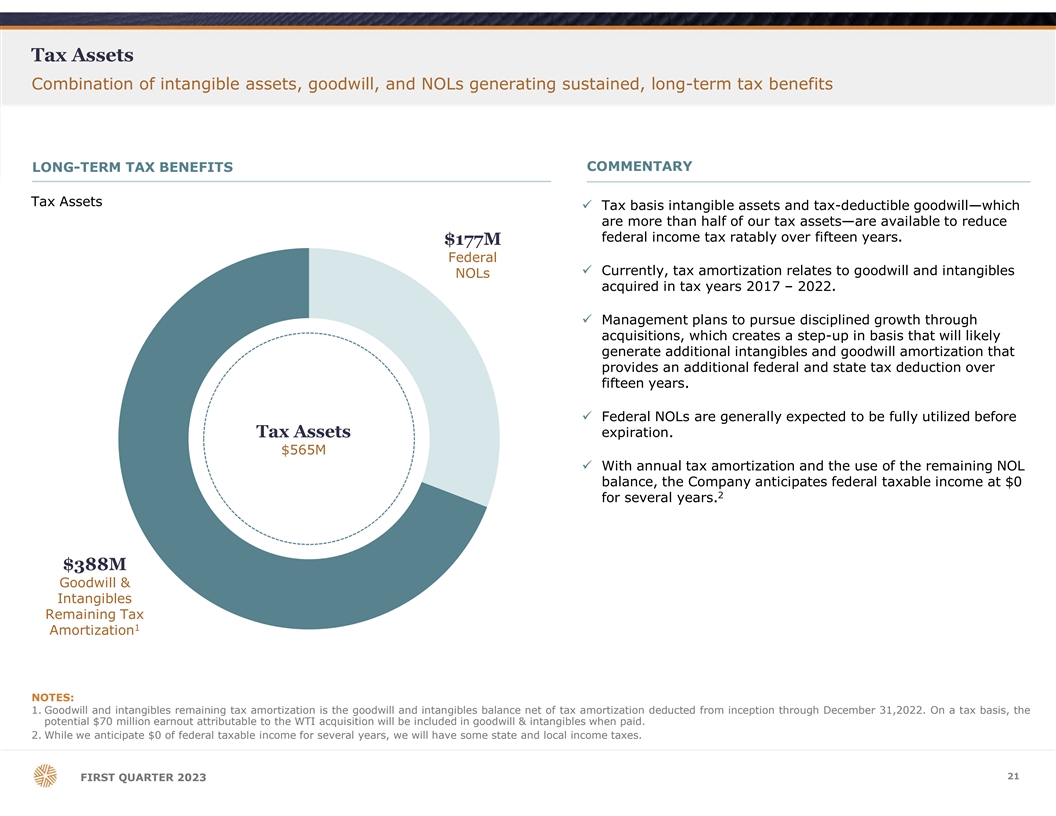 Tax Assets Combination of intangible assets, goodwill, and NOLs generating sustained, long-term tax benefits COMMENTARY LONG-TERM TAX BENEFITS Tax Assets ü Tax basis intangible assets and tax-deductible goodwill—which are more than half of our tax assets—are available to reduce federal income tax ratably over fifteen years. $177M Federal ü Currently, tax amortization relates to goodwill and intangibles NOLs acquired in tax years 2017 – 2022. ü Management plans to pursue disciplined growth through acquisitions, which creates a step-up in basis that will likely generate additional intangibles and goodwill amortization that provides an additional federal and state tax deduction over fifteen years. ü Federal NOLs are generally expected to be fully utilized before Tax Assets expiration. $565M ü With annual tax amortization and the use of the remaining NOL balance, the Company anticipates federal taxable income at $0 2 for several years. $388M Goodwill & Intangibles Remaining Tax 1 Amortization NOTES: 1. Goodwill and intangibles remaining tax amortization is the goodwill and intangibles balance net of tax amortization deducted from inception through December 31,2022. On a tax basis, the potential $70 million earnout attributable to the WTI acquisition will be included in goodwill & intangibles when paid. 2. While we anticipate $0 of federal taxable income for several years, we will have some state and local income taxes. 21 FIRST QUARTER 2023