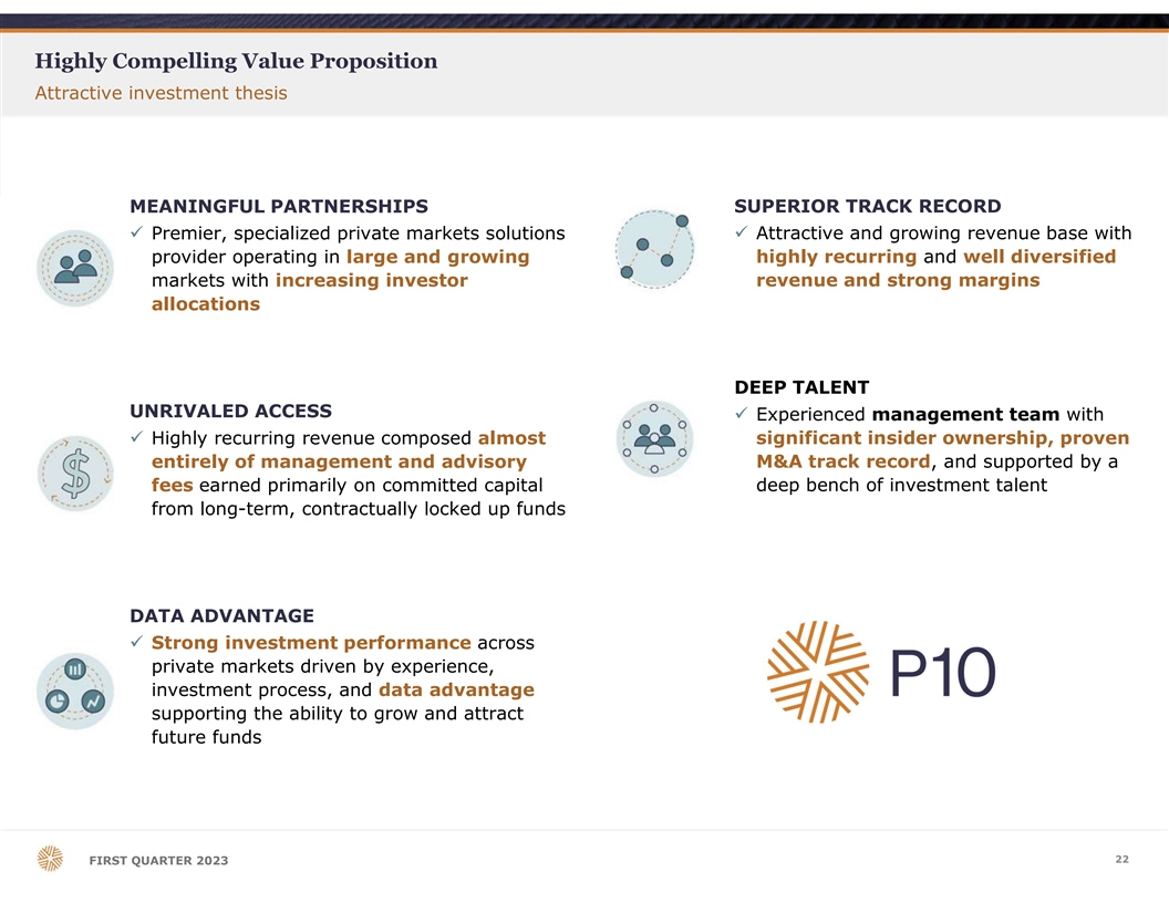 Highly Compelling Value Proposition Attractive investment thesis MEANINGFUL PARTNERSHIPS SUPERIOR TRACK RECORD ü Premier, specialized private markets solutions ü Attractive and growing revenue base with provider operating in large and growing highly recurring and well diversified markets with increasing investor revenue and strong margins allocations DEEP TALENT UNRIVALED ACCESS ü Experienced management team with ü Highly recurring revenue composed almost significant insider ownership, proven entirely of management and advisory M&A track record, and supported by a fees earned primarily on committed capital deep bench of investment talent from long-term, contractually locked up funds DATA ADVANTAGE ü Strong investment performance across private markets driven by experience, investment process, and data advantage supporting the ability to grow and attract future funds 22 FIRST QUARTER 2023