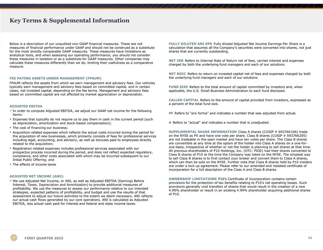 Key Terms & Supplemental Information Below is a description of our unaudited non-GAAP financial measures. These are not FULLY DILUTED ANI EPS Fully diluted Adjusted Net Income Earnings Per Share is a measures of financial performance under GAAP and should not be construed as a substitute calculation that assumes all the Company’s securities were converted into shares, not just for the most directly comparable GAAP measures. These measures have limitations as shares that are currently outstanding. analytical tools, and when assessing our operating performance, you should not consider these measures in isolation or as a substitute for GAAP measures. Other companies may NET IRR Refers to Internal Rate of Return net of fees, carried interest and expenses calculate these measures differently than we do, limiting their usefulness as a comparative charged by both the underlying fund managers and each of our solutions. measure. NET ROIC Refers to return on invested capital net of fees and expenses charged by both the underlying fund managers and each of our solutions. FEE PAYING ASSETS UNDER MANAGEMENT (FPAUM) FPAUM reflects the assets from which we earn management and advisory fees. Our vehicles typically earn management and advisory fees based on committed capital, and in certain FUND SIZE Refers to the total amount of capital committed by investors and, when cases, net invested capital, depending on the fee terms. Management and advisory fees applicable, the U.S. Small Business Administration to each fund disclosed. based on committed capital are not affected by market appreciation or depreciation. CALLED CAPITAL Refers to the amount of capital provided from investors, expressed as a percent of the total fund size. ADJUSTED EBITDA üIn order to compute Adjusted EBITDA, we adjust our GAAP net income for the following PF Refers to “pro forma” and indicates a number that was adjusted from actual. items: § Expenses that typically do not require us to pay them in cash in the current period (such A Refers to “actual” and indicates a number that is unadjusted. as depreciation, amortization and stock-based compensation); § The cost of financing our business; SUPPLEMENTAL SHARE INFORMATION Class A shares (CUSIP # 69376K106) trade § Acquisition-related expenses which reflects the actual costs incurred during the period for on the NYSE as PX and have one vote per share. Class B shares (CUSIP # 69376K205) the acquisition of new businesses, which primarily consists of fees for professional services are not tradeable in the open market and have ten votes per share. The Class B shares including legal, accounting, and advisory, as well as bonuses paid to employees directly are convertible at any time at the option of the holder into Class A shares on a one-for- related to the acquisition; one basis, irrespective of whether or not the holder is planning to sell shares at that time. § Registration-related expenses includes professional services associated with our All previous shareholders of P10 Holdings, Inc. (OTC: PIOE) had their shares converted to prospectus process incurred during the period, and does not reflect expected regulatory, Class B shares of P10 at the time the Company was listed on the NYSE. The simplest way compliance, and other costs associated with which may be incurred subsequent to our to sell Class B shares is to first contact your broker and convert them to Class A shares, Initial Public Offering; and which can then be sold on the NYSE. Further note that Class B shares held by P10 insiders The effects of income taxes § are under a lock up agreement. Please refer to our amended and restated certificate of incorporation for a full description of the Class A and Class B shares. ADJUSTED NET INCOME (ANI): OWNERSHIP LIMITATIONS P10’s Certificate of Incorporation contains certain üWe use Adjusted Net Income, or ANI, as well as Adjusted EBITDA (Earnings Before provisions for the protection of tax benefits relating to P10’s net operating losses. Such Interest, Taxes, Depreciation and Amortization) to provide additional measures of provisions generally void transfers of shares that would result in the creation of a new profitability. We use the measures to assess our performance relative to our intended 4.99% shareholder or result in an existing 4.99% shareholder acquiring additional shares strategies, expected patterns of profitability, and budget and use the results of that of P10. assessment to adjust our future activities to the extent we deem necessary. ANI reflects our actual cash flows generated by our core operations. ANI is calculated as Adjusted EBITDA, less actual cash paid for interest and federal and state income taxes. 2 23 3 FIRST QUARTER 2023