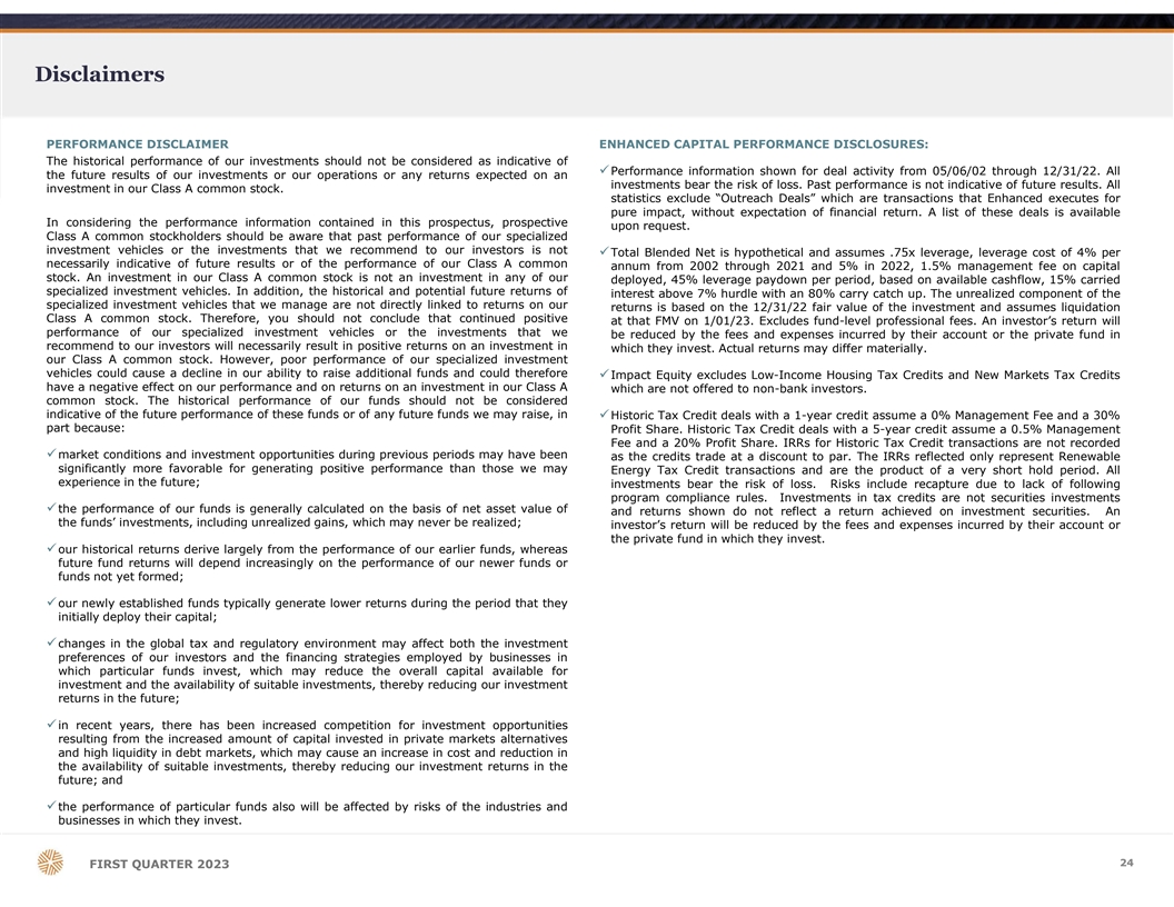 Disclaimers PERFORMANCE DISCLAIMER ENHANCED CAPITAL PERFORMANCE DISCLOSURES: The historical performance of our investments should not be considered as indicative of üPerformance information shown for deal activity from 05/06/02 through 12/31/22. All the future results of our investments or our operations or any returns expected on an investments bear the risk of loss. Past performance is not indicative of future results. All investment in our Class A common stock. statistics exclude “Outreach Deals” which are transactions that Enhanced executes for pure impact, without expectation of financial return. A list of these deals is available In considering the performance information contained in this prospectus, prospective upon request. Class A common stockholders should be aware that past performance of our specialized investment vehicles or the investments that we recommend to our investors is not üTotal Blended Net is hypothetical and assumes .75x leverage, leverage cost of 4% per necessarily indicative of future results or of the performance of our Class A common annum from 2002 through 2021 and 5% in 2022, 1.5% management fee on capital stock. An investment in our Class A common stock is not an investment in any of our deployed, 45% leverage paydown per period, based on available cashflow, 15% carried specialized investment vehicles. In addition, the historical and potential future returns of interest above 7% hurdle with an 80% carry catch up. The unrealized component of the specialized investment vehicles that we manage are not directly linked to returns on our returns is based on the 12/31/22 fair value of the investment and assumes liquidation Class A common stock. Therefore, you should not conclude that continued positive at that FMV on 1/01/23. Excludes fund-level professional fees. An investor’s return will performance of our specialized investment vehicles or the investments that we be reduced by the fees and expenses incurred by their account or the private fund in recommend to our investors will necessarily result in positive returns on an investment in which they invest. Actual returns may differ materially. our Class A common stock. However, poor performance of our specialized investment vehicles could cause a decline in our ability to raise additional funds and could therefore üImpact Equity excludes Low-Income Housing Tax Credits and New Markets Tax Credits have a negative effect on our performance and on returns on an investment in our Class A which are not offered to non-bank investors. common stock. The historical performance of our funds should not be considered indicative of the future performance of these funds or of any future funds we may raise, in üHistoric Tax Credit deals with a 1-year credit assume a 0% Management Fee and a 30% part because: Profit Share. Historic Tax Credit deals with a 5-year credit assume a 0.5% Management Fee and a 20% Profit Share. IRRs for Historic Tax Credit transactions are not recorded ümarket conditions and investment opportunities during previous periods may have been as the credits trade at a discount to par. The IRRs reflected only represent Renewable significantly more favorable for generating positive performance than those we may Energy Tax Credit transactions and are the product of a very short hold period. All experience in the future; investments bear the risk of loss. Risks include recapture due to lack of following program compliance rules. Investments in tax credits are not securities investments üthe performance of our funds is generally calculated on the basis of net asset value of and returns shown do not reflect a return achieved on investment securities. An the funds’ investments, including unrealized gains, which may never be realized; investor’s return will be reduced by the fees and expenses incurred by their account or the private fund in which they invest. üour historical returns derive largely from the performance of our earlier funds, whereas future fund returns will depend increasingly on the performance of our newer funds or funds not yet formed; üour newly established funds typically generate lower returns during the period that they initially deploy their capital; üchanges in the global tax and regulatory environment may affect both the investment preferences of our investors and the financing strategies employed by businesses in which particular funds invest, which may reduce the overall capital available for investment and the availability of suitable investments, thereby reducing our investment returns in the future; üin recent years, there has been increased competition for investment opportunities resulting from the increased amount of capital invested in private markets alternatives and high liquidity in debt markets, which may cause an increase in cost and reduction in the availability of suitable investments, thereby reducing our investment returns in the future; and üthe performance of particular funds also will be affected by risks of the industries and businesses in which they invest. 2 24 4 FIRST QUARTER 2023