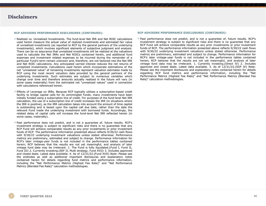 Disclaimers RCP ADVISORS PERFORMANCE DISCLOSURES: üThe actual performance returns of each investor may vary (in some cases, materially) and are dependent on a number of factors including, but not limited to, (a) the timing of üThe historical returns of RCP Advisors are not necessarily indicative of the future an investor’s capital contributions, including as a result of a later subscription date and performance of a Fund and there can be no assurance that the returns described herein lower preferred return, (b) differences in fees or expenses allocable to certain investors or comparable returns will be achieved by any Fund. as a result of taxes or other considerations, (c) the fact that certain investors may have negotiated reduced, waived or otherwise modified management fee and/or carried üPerformance metrics are presented for the limited partners of each respective Fund as a interest rates with the Fund’s general partner, and (d) the excuse or exclusion of an single class, taken as a whole. Certain limited partners, who have met specific investor from one or more of such Fund’s investments. Accordingly, the actual requirements, may have different preferred returns, as well as different carry performance of an individual investor may differ from the returns presented herein. percentages. In addition, the General Partner of each Fund may agree to reduce the management fees for certain limited partners in accordance with the applicable Fund’s üRCP Fund Performance Data – Selection Criteria. The tables on slides 6 and 7 herein Partnership Agreement. reflect the past performance of RCP’s commingled (i) funds-of-funds* and dedicated secondary funds which are at least 50% funded (in the aggregate) at the underlying üThe actual performance returns of each investor may vary and are dependent upon the investment level and (ii) dedicated co-investment funds which have called at least 50% specific preferred return hurdles, management fees, and carried interest expense of capital commitments at the RCP Fund level; accordingly, certain other investment charged to such investor and the timing of capital transactions for such investor. vehicles (including discretionary and non-discretionary separate accounts) which RCP has sponsored, advised, or sub-advised have been excluded. *Because Fund XIV is 45% üPerformance Metrics (Highest Fee Rate). funded (in the aggregate) at the underlying investment level (as of 9/30/22), but is expected to exceed the 50% funded threshold in the near-term, Fund XIV performance üROIC: Represents the return on invested capital of a “representative investor” in a returns are also included. Performance information for RCP’s later vintage-year funds is particular Fund. ROIC is calculated by dividing the sum of the representative investor’s not included in the performance tables contained herein; RCP believes that the results distributions plus capital balance by capital contributed. Representative investor’s are not yet meaningful, and analysis of later vintage fund data may be irrelevant. capital balance is the book assets (fair value of unrealized investments plus cash on Performance metrics are preliminary, estimated and subject to change. hand and miscellaneous assets) less the liabilities at the measurement date. üRCP SEF Performance. Because RCP’s inaugural “small and emerging manager” fund üD/PI: Calculated by dividing a representative investor’s cumulative distributions by the (which was structured using two distinct parallel investment vehicles – RCP Small and sum of capital contributions. Emerging Fund, LP (“SEF (Main)”) and RCP Small and Emerging Parallel Fund, LP (“RCP SEF Parallel”) – only accepted commitments from two unaffiliated (anchor) investors, üIRR: Represents the internal rate of return of a “representative investor” in a particular the performance returns of SEF (Main) and RCP SEF Parallel contained herein reflect Fund. IRR is a time-weighted average expressed as a percentage. The IRR of an fee/carry rates not typically associated with RCP’s commingled funds (specifically, investment is the discount rate at which the net present value of costs (negative cash unaffiliated investors in such vehicles pay 0% management fees and 10% carried flows) of the investment equals the net present value of the benefits (positive cash interest). The SEF (Main) and RCP SEF Parallel returns would be reduced by the effect flows) of the investment, including the current value of unrealized investments. of typical management fees charged to investors in RCP’s commingled funds. Performance information for RCP SEF Parallel is not included in the performance tables üNet Performance Metrics (Highest Fee Rate). Net ROIC, Net D/PI, and Net IRR reflects contained herein. As of 9/30/22, RCP SEF Parallel has a Net IRR of 26.7%, Net ROIC of the return of a “representative investor” in a particular Fund that: (i) is in good 1.9x, and Net D/PI of 0.50. standing; (ii) where more than one investment vehicle is established to accommodate investors with different tax and/or regulatory requirements, invested in such Fund via üDirect Fund Performance. With limited exceptions, Direct Funds generally do not pay the Delaware “onshore” vehicle; (iii) subscribed at the earliest closing in which third-party management fees since the Direct Funds invest directly (or indirectly unaffiliated LPs paying the highest level of fees and expenses (including, without through special purpose vehicles) in equity investments and not in other private equity limitation, management fees, carried interest and, in the case of certain earlier vintage funds. The Direct Fund returns would be reduced by the effect of typical third-party RCP Funds, “due diligence fees,” if applicable) chargeable to an investor in such Fund management fees charged to RCP’s commingled primary and secondary funds. were admitted; (iv) is not affiliated with the Fund