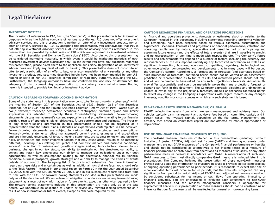 Legal Disclaimer IMPORTANT NOTICES CAUTION REGARDING FINANCIAL AND OPERATING PROJECTIONS The inclusion of references to P10, Inc. (the “Company”) in this presentation is for information All financial and operating projections, forecasts or estimates about or relating to the purposes only as the holding company of various subsidiaries. P10 does not offer investment Company included in this document, including statements regarding pro-forma valuation advisory services and this presentation is neither an offer of any investment products nor an and ownership, have been prepared based on various estimates, assumptions and offer of advisory services by P10. By accepting this presentation, you acknowledge that P10 is hypothetical scenarios. Forecasts and projections of financial performance, valuation and not offering investment advisory services. All investment advisory services referenced in this operating results are, by nature, speculative and based in part on anticipating and presentation are provided by subsidiaries of P10 which are registered as investment advisers assuming future events (and the effects of future events) that are impossible to predict with the U.S. Securities and Exchange Commission (“SEC”). Accordingly, this presentation may and no representation of any kind is made with respect thereto. The Company’s future be considered marketing materials, in which event it would be marketing materials of each results and achievements will depend on a number of factors, including the accuracy and registered investment adviser subsidiary only. To the extent you have any questions regarding reasonableness of the assumptions underlying any forecasted information as well as on this presentation, please direct them to the applicable subsidiary. Registration as an investment significant transaction, business, economic, competitive, regulatory, technological and adviser does not imply any level of skill or training. This presentation does not constitute an other uncertainties, contingencies and developments that in many cases will be beyond offer to sell, a solicitation of an offer to buy, or a recommendation of any security or any other the Company’s control. Accordingly, all projections or forecasts (and estimates based on investment product. Any securities described herein have not been recommended by any U.S. such projections or forecasts) contained herein should not be viewed as an assessment, federal or state or non-U.S. securities commission or regulatory authority, including the SEC. prediction or representation as to future results and interested parties should not rely, Furthermore, the foregoing authorities have not confirmed the accuracy or determined the and will not be deemed to have relied, on any such projections or forecasts. Actual results adequacy of this document. Any representation to the contrary is a criminal offense. Nothing may differ substantially and could be materially worse than any projection, forecast or herein is intended to provide tax, legal or investment advice. scenario set forth in this document. The Company expressly disclaims any obligation to update or revise any of the projections, forecasts, models or scenarios contained herein to reflect any change in the Company’s expectations with regard thereto or any changes CAUTION REGARDING FORWARD-LOOKING INFORMATION in events, conditions or circumstances on which any such statement is based. Some of the statements in this presentation may constitute forward-looking statements within the meaning of Section 27A of the Securities Act of 1933, Section 21E of the Securities FEE-PAYING ASSETS UNDER MANAGEMENT, OR FPAUM Exchange Act of 1934 and the Private Securities Litigation Reform Act of 1995. Words such as will, expect, believe, estimate, continue, anticipate, intend, plan“ and similar FPAUM reflects the assets from which we earn management and advisory fees. Our expressions are intended to identify these forward-looking statements. Forward-looking vehicles typically earn management and advisory fees based on committed capital, and in statements discuss management's current expectations and projections relating to our financial certain cases, net invested capital, depending on the fee terms. Management and position, results of operations, plans, objectives, future performance and business. The inclusion advisory fees based on committed capital are not affected by market appreciation or of any forward-looking information in this presentation should not be regarded as a depreciation. representation that the future plans, estimates or expectations contemplated will be achieved. Forward-looking statements are subject to various risks, uncertainties and assumptions. Forward-looking statements reflect management’s current plans, estimates and expectations USE OF NON-GAAP FINANCIAL MEASURES BY P10, INC. and are inherently uncertain. All forward-looking statements are subject to known and unknown The non-GAAP financial measures contained in this presentation (including, without risks, uncertainties and other important factors that may cause actual results to be materially limitation, Adjusted EBITDA, Adjusted Net Income (“ANI”) and fee-paying assets under different, including risks relating to: global and domestic market and business conditions; management are not GAAP measures of the Company’s financial performance or liquidity successful execution of business and growth strategies and regulatory factors relevant to our and should not be considered as alternatives to net income (loss) as a measure of business; changes in our tax status; our ability to maintain our fee structure; our ability to financial performance or cash flows from operations as measures of liquidity, or any other attract and retain key employees; our ability to manage our obligations under our debt performance measure derived in accordance with GAAP. A reconciliation of such non- agreements; as well as assumptions relatin