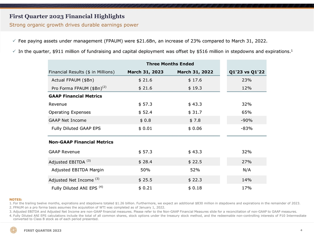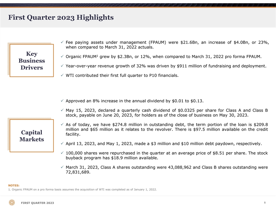 First Quarter 2023 Financial Highlights Strong organic growth drives durable earnings power ü Fee paying assets under management (FPAUM) were $21.6Bn, an increase of 23% compared to March 31, 2022. 1 ü In the quarter, $911 million of fundraising and capital deployment was offset by $516 million in stepdowns and expirations. Three Months Ended Financial Results ($ in Millions) March 31, 2023 March 31, 2022 Q1'23 vs Q1'22 Actual FPAUM ($Bn) $ 21.6 $ 17.6 23% (2) Pro Forma FPAUM ($Bn) $ 21.6 $ 19.3 12% GAAP Financial Metrics Revenue $ 57.3 $ 43.3 32% Operating Expenses $ 52.4 $ 31.7 65% GAAP Net Income $ 0.8 $ 7.8 -90% Fully Diluted GAAP EPS $ 0.01 $ 0.06 -83% Non-GAAP Financial Metrics GAAP Revenue $ 57.3 $ 43.3 32% (3) $ 28.4 $ 22.5 27% Adjusted EBITDA Adjusted EBITDA Margin 50% 52% N/A (3) Adjusted Net Income $ 25.5 $ 22.3 14% (4) $ 0.21 $ 0.18 17% Fully Diluted ANI EPS NOTES: 1. For the trailing twelve months, expirations and stepdowns totaled $1.26 billion. Furthermore, we expect an additional $830 million in stepdowns and expirations in the remainder of 2023. 2. FPAUM on a pro forma basis assumes the acquisition of WTI was completed as of January 1, 2022. 3. Adjusted EBITDA and Adjusted Net Income are non-GAAP financial measures. Please refer to the Non-GAAP Financial Measures slide for a reconciliation of non-GAAP to GAAP measures. 4. Fully Diluted ANI EPS calculations include the total of all common shares, stock options under the treasury stock method, and the redeemable non-controlling interests of P10 Intermediate converted to Class B stock as of each period presented. 4 FIRST QUARTER 2023