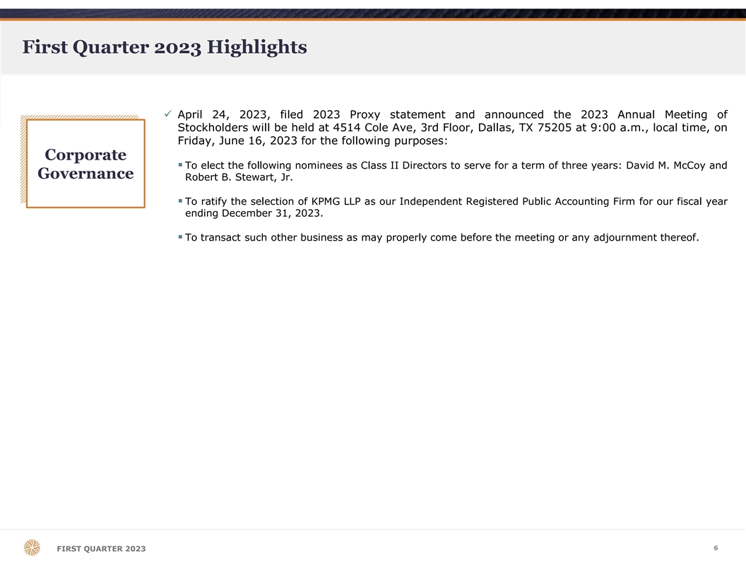 First Quarter 2023 Highlights ü April 24, 2023, filed 2023 Proxy statement and announced the 2023 Annual Meeting of Stockholders will be held at 4514 Cole Ave, 3rd Floor, Dallas, TX 75205 at 9:00 a.m., local time, on Friday, June 16, 2023 for the following purposes: Corporate § To elect the following nominees as Class II Directors to serve for a term of three years: David M. McCoy and Governance Robert B. Stewart, Jr. § To ratify the selection of KPMG LLP as our Independent Registered Public Accounting Firm for our fiscal year ending December 31, 2023. § To transact such other business as may properly come before the meeting or any adjournment thereof. 6 FIRST QUARTER 2023