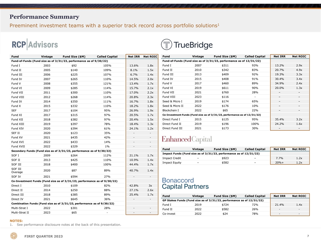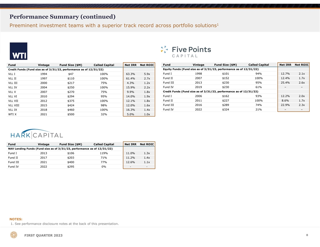 Performance Summary 1 Preeminent investment teams with a superior track record across portfolio solutions Fund Vintage Fund Size ($M) Called Capital Net IRR Net ROIC Fund Vintage Fund Size ($M) Called Capital Net IRR Net ROIC Fund-of-Funds (Fund size as of 3/31/23, performance as of 9/30/22) Fund-of-Funds (Fund size as of 3/31/23, performance as of 12/31/22) Fund I 2003 $92 105% 13.6% 1.8x Fund I 2007 $311 93% 13.2% 2.9x Fund II 2005 $140 109% 8.1% 1.5x Fund II 2010 $342 83% 20.7% 4.9x Fund III 2013 $409 92% 19.3% 3.3x Fund III 2006 $225 107% 6.7% 1.4x Fund IV 2015 $408 91% 30.4% 3.4x Fund IV 2007 $265 110% 14.5% 2.0x Fund V 2017 $460 89% 34.9% 2.4x Fund V 2008 $355 121% 13.4% 1.7x Fund VI 2009 $285 114% 15.7% 2.1x Fund VI 2019 $611 90% 20.0% 1.3x Fund VII 2011 $300 110% 17.0% 2.2x Fund VII 2021 $760 28% – – Fund VIII 2012 $268 114% 20.8% 2.3x Fund VIII 2023 $116 - – – Fund IX 2014 $350 111% 16.7% 1.8x Seed & Micro I 2019 $174 65% – – Fund X 2015 $332 110% 18.2% 1.8x Seed & Micro II 2022 $176 10% – – SEF 2017 $104 95% 26.9% 1.9x Blockchain I 2022 $65 22% – – Fund XI 2017 $315 97% 20.5% 1.7x Co-Investment Funds (Fund size as of 3/31/23, performance as of 12/31/22) Direct Fund I 2015 $125 95% 35.4% 3.2x Fund XII 2018 $382 97% 20.4% 1.5x Direct Fund II 2019 $196 100% 24.2% 1.6x Fund XIII 2019 $397 78% 18.4% 1.3x Direct Fund III 2021 $173 30% – – Fund XIV 2020 $394 61% 24.1% 1.2x SEF II 2020 $123 35% - - Fund XV 2021 $435 42% - - Fund XVI 2022 $433 14% - - Fund XVII 2022 $329 1% - - Fund Vintage Fund Size ($M) Called Capital Net IRR Net ROIC Secondary Funds (Fund size as of 3/31/23, performance as of 9/30/22) Impact Funds (Fund size as of 3/31/23, performance as of 12/31/22) SOF I 2009 $264 112% 21.1% 1.7x Impact Credit – $923 – 7.7% 1.2x SOF II 2013 $425 110% 10.9% 1.4x Impact Equity – $582 – 20%+ 1.2x SOF III 2018 $400 100% 44.4% 1.7x SOF III 2020 $87 89% 40.7% 1.4x Overage SOF IV 2021 $594 27% - - Co-Investment Funds (Fund size as of 3/31/23, performance as of 9/30/22) Direct I 2010 $109 82% 42.8% 3x Direct II 2014 $250 88% 27.1% 2.6x Direct III 2018 $385 89% 25.4% 1.7x Fund Vintage Fund Size ($M) Called Capital Net IRR Net ROIC Direct IV 2021 $645 36% - - GP Stakes Funds (Fund size as of 3/31/23, performance as of 12/31/22) Combination Funds (Fund size as of 3/31/23, performance as of 9/30/22) Fund I 2019 $724 72% 21.4% 1.4x Multi-Strat I 2022 $301 28% - - Fund II 2022 $582 26% - - Multi-Strat II 2023 $65 - - - Co-invest 2022 $24 78% - - NOTES: 1. See performance disclosure notes at the back of this presentation. 7 FIRST QUARTER 2023