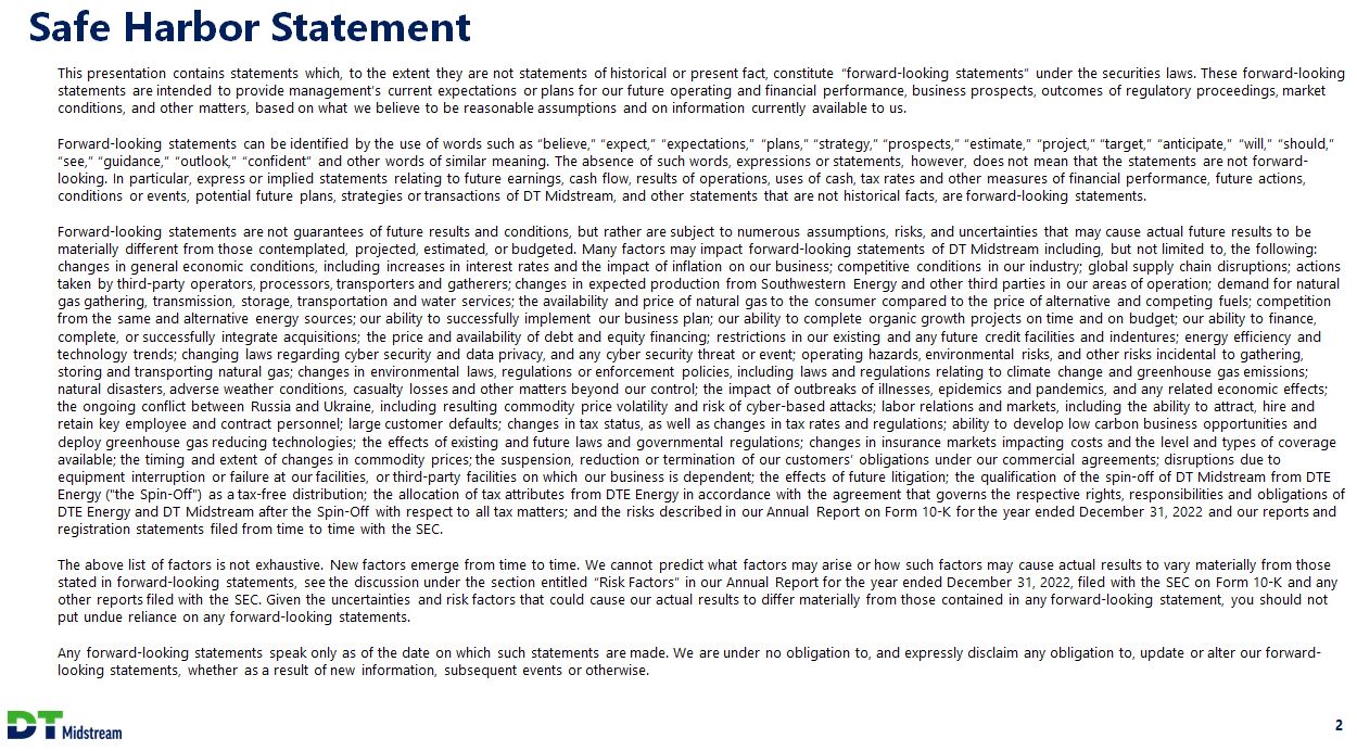 Safe Harbor Statement This presentation contains statements which, to the extent they are not statements of historical or present fact, constitute "forward-looking statements" under the securities laws. These forward-looking statements are intended to provide management's current expectations or plans for our future operating and financial performance, business prospects, outcomes of regulatory proceedings, market conditions, and other matters, based on what we believe to be reasonable assumptions and on information currently available to us. Forward-looking statements can be identified by the use of words such as "believe," "expect," "expectations," "plans," "strategy," "prospects," "estimate," "project," "target," "anticipate," "will," "should," "see," "guidance," "outlook," "confident" and other words of similar meaning. The absence of such words, expressions or statements, however, does not mean that the statements are not forward-looking. In particular, express or implied statements relating to future earnings, cash flow, results of operations, uses of cash, tax rates and other measures of financial performance, future actions, conditions or events, potential future plans, strategies or transactions of DT Midstream, and other statements that are not historical facts, are forward-looking statements. Forward-looking statements are not guarantees of future results and conditions, but rather are subject to numerous assumptions, risks, and uncertainties that may cause actual future results to be materially different from those contemplated, projected, estimated, or budgeted. Many factors may impact forward-looking statements of DT Midstream including, but not limited to, the following: changes in general economic conditions, including increases in interest rates and the impact of inflation on our business; competitive conditions in our industry; global supply chain disruptions; actions taken by third-party operators, processors, transporters and gatherers; changes in expected production from Southwestern Energy and other third parties in our areas of operation; demand for natural gas gathering, transmission, storage, transportation and water services; the availability and price of natural gas to the consumer compared to the price of alternative and competing fuels; competition from the same and alternative energy sources; our ability to successfully implement our business plan; our ability to complete organic growth projects on time and on budget; our ability to finance, complete, or successfully integrate acquisitions; the price and availability of debt and equity financing; restrictions in our existing and any future credit facilities and indentures; energy efficiency and technology trends; changing laws regarding cyber security and data privacy, and any cyber security threat or event; operating hazards, environmental risks, and other risks incidental to gathering, storing and transporting natural gas; changes in environmental laws, regulations or enforcement policies, including laws and regulations relating to climate change and greenhouse gas emissions; natural disasters, adverse weather conditions, casualty losses and other matters beyond our control; the impact of outbreaks of illnesses, epidemics and pandemics, and any related economic effects; the ongoing conflict between Russia and Ukraine, including resulting commodity price volatility and risk of cyber-based attacks; labor relations and markets, including the ability to attract, hire and retain key employee and contract personnel; large customer defaults; changes in tax status, as well as changes in tax rates and regulations; ability to develop low carbon business opportunities and deploy greenhouse gas reducing technologies; the effects of existing and future laws and governmental regulations; changes in insurance markets impacting costs and the level and types of coverage available; the timing and extent of changes in commodity prices; the suspension, reduction or termination of our customers' obligations under our commercial agreements; disruptions due to equipment interruption or failure at our facilities, or third-party facilities on which our business is dependent; the effects of future litigation; the qualification of the spin-off of DT Midstream from DTE Energy ("the Spin-Off") as a tax-free distribution; the allocation of tax attributes from DTE Energy in accordance with the agreement that governs the respective rights, responsibilities and obligations of DTE Energy and DT Midstream after the Spin-Off with respect to all tax matters; and the risks described in our Annual Report on Form 10-K for the year ended December 31, 2022 and our reports and registration statements filed from time to time with the SEC. The above list of factors is not exhaustive. New factors emerge from time to time. We cannot predict what factors may arise or how such factors may cause actual results to vary materially from those stated in forward-looking statements, see the discussion under the section entitled "Risk Factors" in our Annual Report for the year ended December 31, 2022, filed with the SEC on Form 10-K and any other reports filed with the SEC. Given the uncertainties and risk factors that could cause our actual results to differ materially from those contained in any forward-looking statement, you should not put undue reliance on any forward-looking statements. Any forward-looking statements speak only as of the date on which such statements are made. We are under no obligation to, and expressly disclaim any obligation to, update or alter our forward-looking statements, whether as a result of new information, subsequent events or otherwise. DT Midstream 2