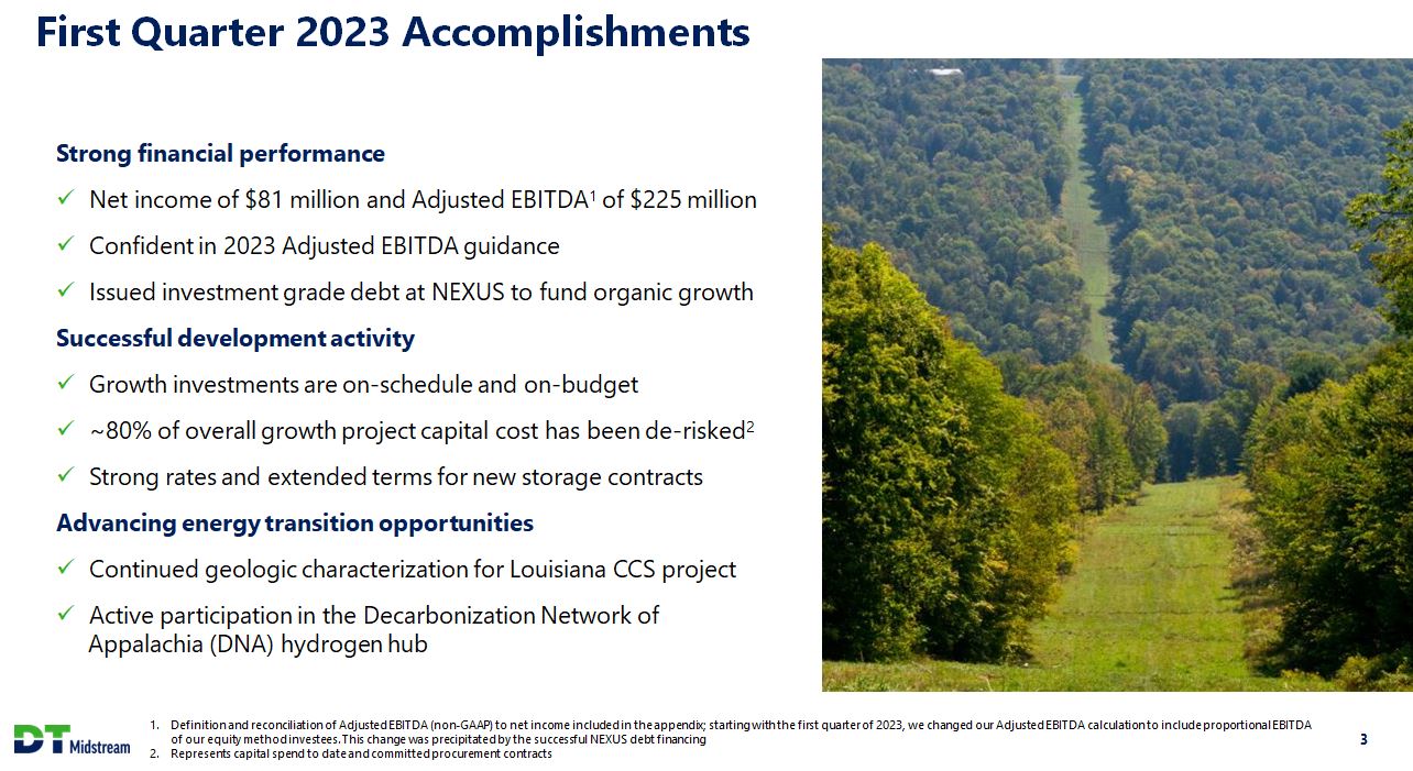 First Quarter 2023 Accomplishments Strong financial performance Net income of $81 million and Adjusted EBITDA1 of $225 million Confident in 2023 Adjusted EBITDA guidance Issued investment grade debt at NEXUS to fund organic growth Successful development activity Growth investments are on-schedule and on-budget ~80% of overall growth project capital cost has been de-risked2 Strong rates and extended terms for new storage contracts Advancing energy transition opportunities Continued geologic characterization for Louisiana CCS project Active participation in the Decarbonization Network of Appalachia (DNA) hydrogen hub DT Midstream 1. Definition and reconciliation of Adjusted EBITDA (non-GAAP) to net income included in the appendix; starting with the first quarter of 2023, we changed our Adjusted EBITDA calculation to include proportional EBITDA of our equity method investees. This change was precipitated by the successful NEXUS debt financing 2. Represents capital spend to date and committed procurement contracts 3