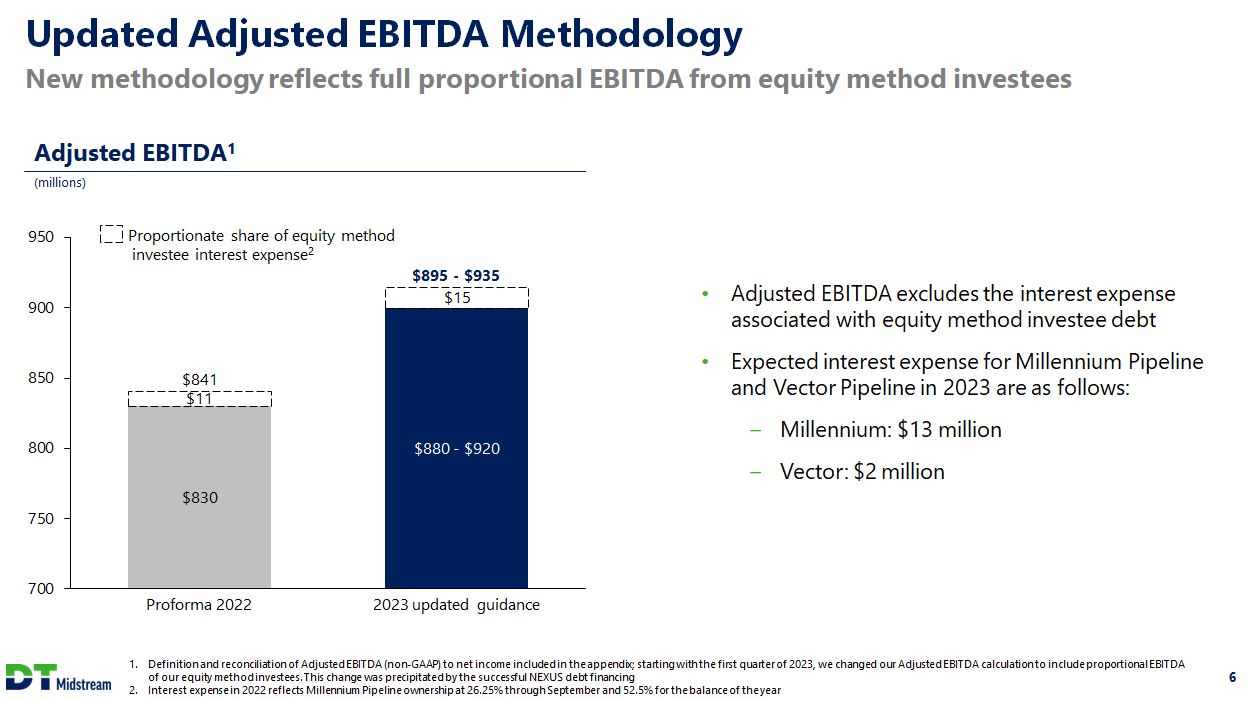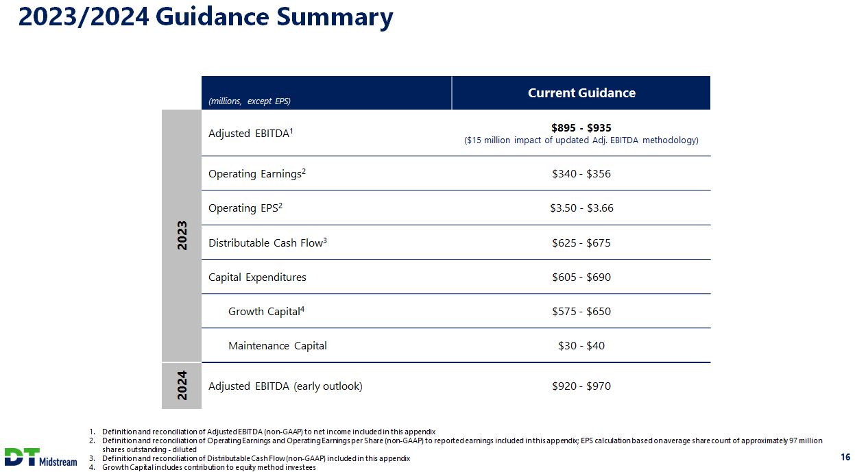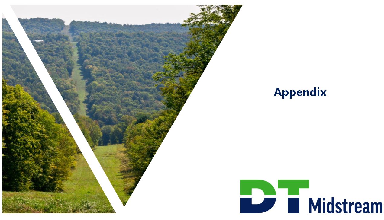 Non-GAAP Definitions Adjusted EBITDA and Distributable Cash Flow (DCF) are non-GAAP measures Adjusted EBITDA is defined as GAAP net income attributable to DT Midstream before expenses for interest, taxes, depreciation and amortization, and loss from financing activities, further adjusted to include our proportional share of net income from our equity method investees (excluding interest, taxes, depreciation and amortization), and to exclude certain items we consider non-routine. We believe Adjusted EBITDA is useful to us and external users of our financial statements in understanding our operating results and the ongoing performance of our underlying business because it allows our management and investors to have a better understanding of our actual operating performance unaffected by the impact of interest, taxes, depreciation, amortization and non-routine charges noted in the table below. We believe the presentation of Adjusted EBITDA is meaningful to investors because it is frequently used by analysts, investors and other interested parties in our industry to evaluate a company's operating performance without regard to items excluded from the calculation of such measure, which can vary substantially from company to company depending on accounting methods, book value of assets, capital structure and the method by which assets were acquired, among other factors. We use Adjusted EBITDA to assess our performance by reportable segment and as a basis for strategic planning and forecasting. Distributable Cash Flow (DCF) is calculated by deducting earnings from equity method investees, depreciation and amortization attributable to noncontrolling interests, cash interest expense, maintenance capital investment (as defined below), and cash taxes from, and adding interest expense, income tax expense, depreciation and amortization, certain items we consider non-routine and dividends and distributions from equity method investees to, Net Income Attributable to DT Midstream. Maintenance capital investment is defined as the total capital expenditures used to maintain or preserve assets or fulfill contractual obligations that do not generate incremental earnings. We believe DCF is a meaningful performance measurement because it is useful to us and external users of our financial statements in estimating the ability of our assets to generate cash earnings after servicing our debt, paying cash taxes and making maintenance capital investments, which could be used for discretionary purposes such as common stock dividends, retirement of debt or expansion capital expenditures. Adjusted EBITDA and DCF are not measures calculated in accordance with GAAP and should be viewed as a supplement to and not a substitute for the results of operations presented in accordance with GAAP. There are significant limitations to using Adjusted EBITDA and DCF as a measure of performance, including the inability to analyze the effect of certain recurring and non-recurring items that materially affect our net income or loss. Additionally, because Adjusted EBITDA and DCF exclude some, but not all, items that affect net income and are defined differently by different companies in our industry, Adjusted EBITDA and DCF do not intend to represent net income attributable to DT Midstream, the most comparable GAAP measure, as an indicator of operating performance and are not necessarily comparable to similarly titled measures reported by other companies. Reconciliation of net income attributable to DT Midstream to Adjusted EBITDA or DCF as projected for full-year 2023 is not provided. We do not forecast net income as we cannot, without unreasonable efforts, estimate or predict with certainty the components of net income. These components, net of tax, may include, but are not limited to, impairments of assets and other charges, divestiture costs, acquisition costs, or changes in accounting principles. All of these components could significantly impact such financial measures. At this time, management is not able to estimate the aggregate impact, if any, of these items on future period reported earnings. Accordingly, we are not able to provide a corresponding GAAP equivalent for Adjusted EBITDA or DCF. DT Midstream 23