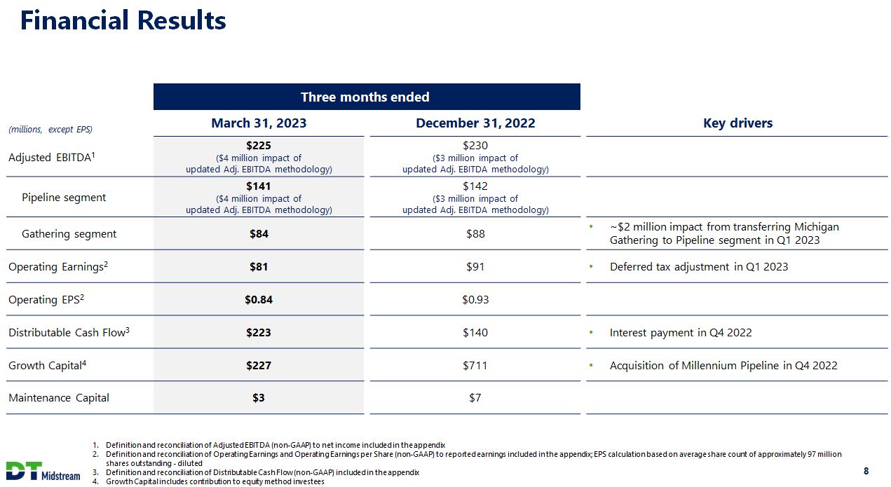 First Quarter 2023 Financial Results Adjusted EBITDA1 (millions), xx segment % of overall $230 $142 $88 Q4 2022 62% 38% $225 $141 $84 Q1 2023 63% 37% Gathering Pipeline DT Midstream 1. Definition and reconciliation of Adjusted EBITDA (non-GAAP) to net income included in the appendix Pipeline Impact of updated Adjusted EBITDA methodology Q1 2023: $4 million Q4 2022: $3 million Gathering ~$2 million impact from transferring Michigan Gathering to Pipeline segment in Q1 2023 following successful service conversion 7