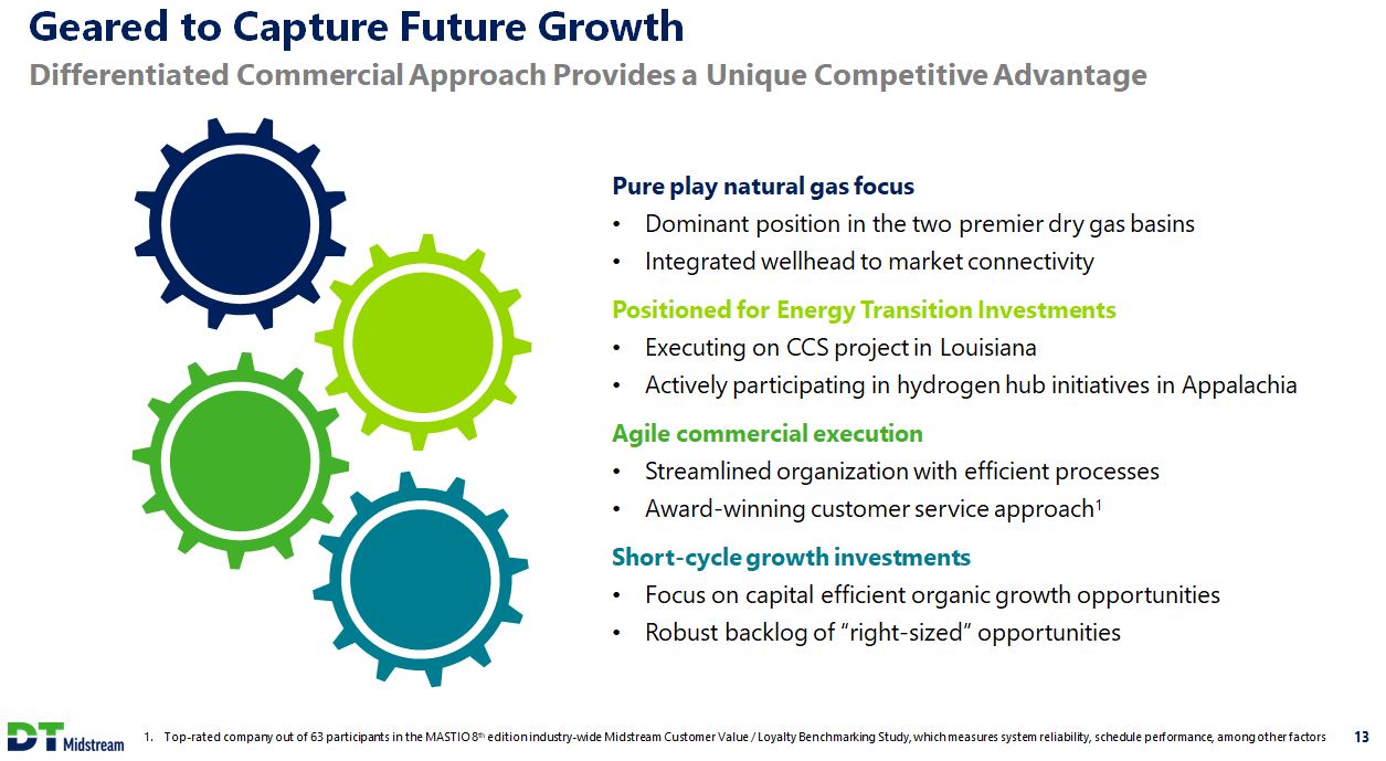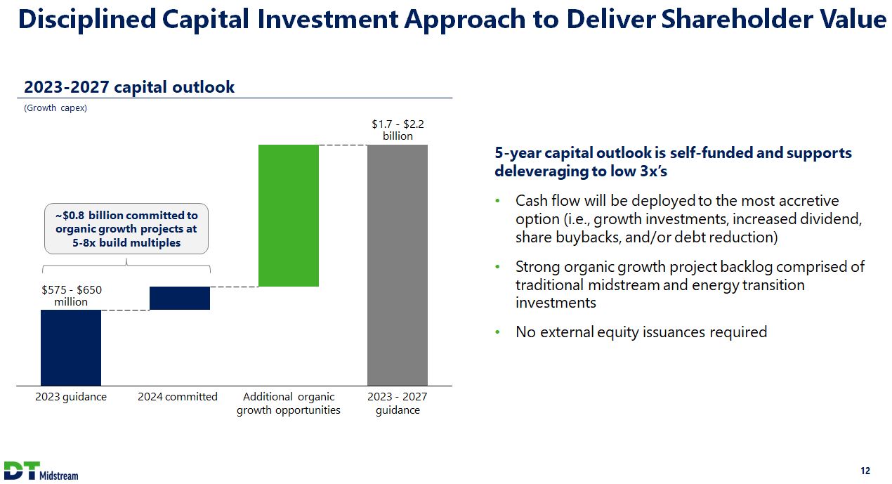 Disciplined Capital Investment Approach to Deliver Shareholder Value 2023-2027 capital outlook (Growth capex) ~$0.8 billion committed to organic growth projects at 5-8x build multiples $575 - $650 million 2023 guidance 2024 committed Additional organic growth opportunities $1.7 - $2.2 billion 2023 - 2027 guidance 5-year capital outlook is self-funded and supports deleveraging to low 3x's Cash flow will be deployed to the most accretive option (i.e., growth investments, increased dividend, share buybacks, and/or debt reduction) Strong organic growth project backlog comprised of traditional midstream and energy transition investments No external equity issuances required DT Midstream 12