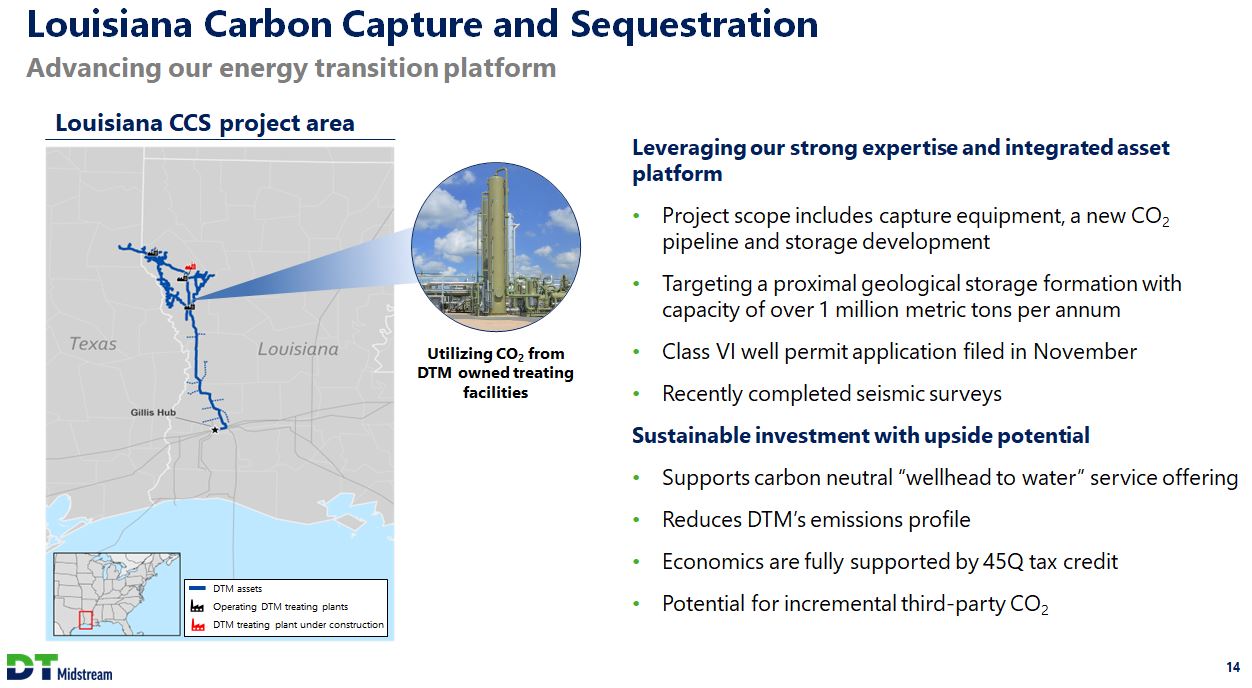 Louisiana Carbon Capture and Sequestration Advancing our energy transition platform Louisiana CCS project area Texas Louisiana Gillis Hub DTM assets Operating DTM treating plants DTM treating plant under construction Utilizing CO2 from DTM owned treating facilities Leveraging our strong expertise and integrated asset platform Project scope includes capture equipment, a new CO2 pipeline and storage development Targeting a proximal geological storage formation with capacity of over 1 million metric tons per annum Class VI well permit application filed in November Recently completed seismic surveys Sustainable investment with upside potential Supports carbon neutral "wellhead to water" service offering Reduces DTM's emissions profile Economics are fully supported by 45Q tax credit Potential for incremental third-party CO2 DT Midstream 1. 14