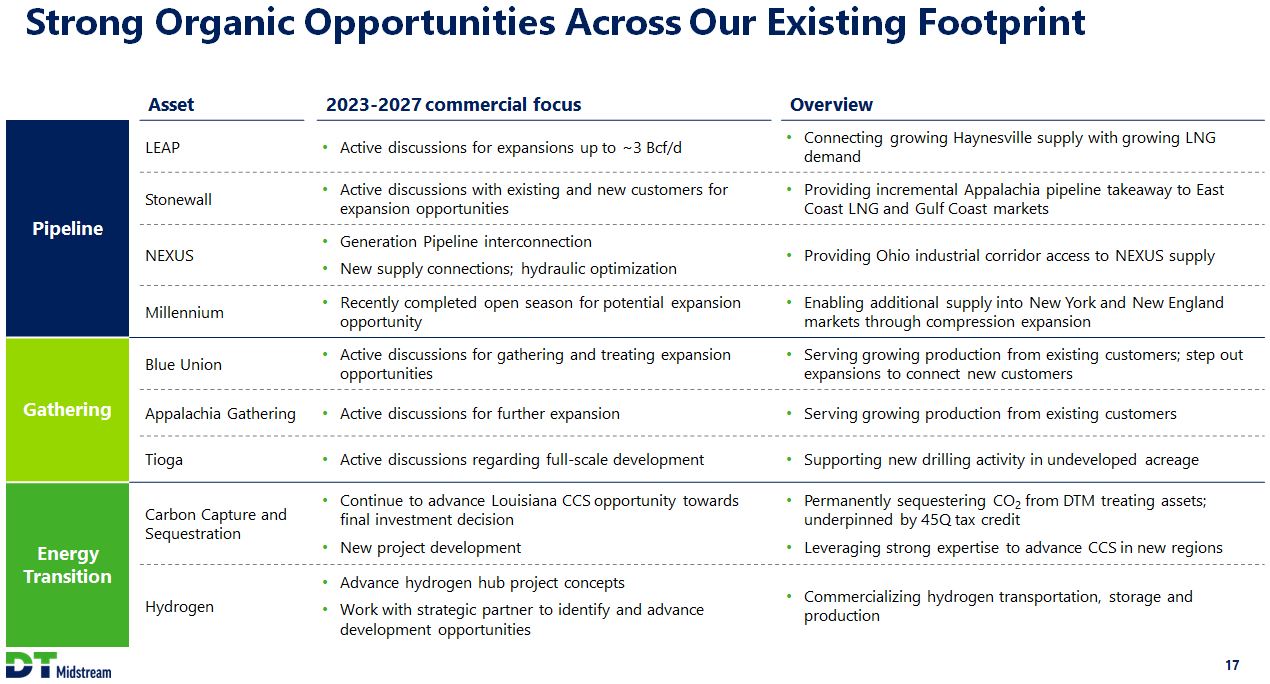 2023/2024 Guidance Summary 2023 2024 (millions, except EPS) Adjusted EBITDA1 Operating Earnings2 Operating EPS2 Distributable Cash Flow3 Capital Expenditures Growth Capital4 Maintenance Capital Adjusted EBITDA (early outlook) Current Guidance $895 - $935 ($15 million impact of updated Adj. EBITDA methodology) $340 - $356 $3.50 - $3.66 $625 - $675 $605 - $690 $575 - $650 $30 - $40 $920 - $970 DT Midstream 1. Definition and reconciliation of Adjusted EBITDA (non-GAAP) to net income included in this appendix 2. Definition and reconciliation of Operating Earnings and Operating Earnings per Share (non-GAAP) to reported earnings included in this appendix; EPS calculation based on average share count of approximately 97 million shares outstanding - diluted 3. Definition and reconciliation of Distributable Cash Flow (non-GAAP) included in this appendix 4. Growth Capital includes contribution to equity method investees 16