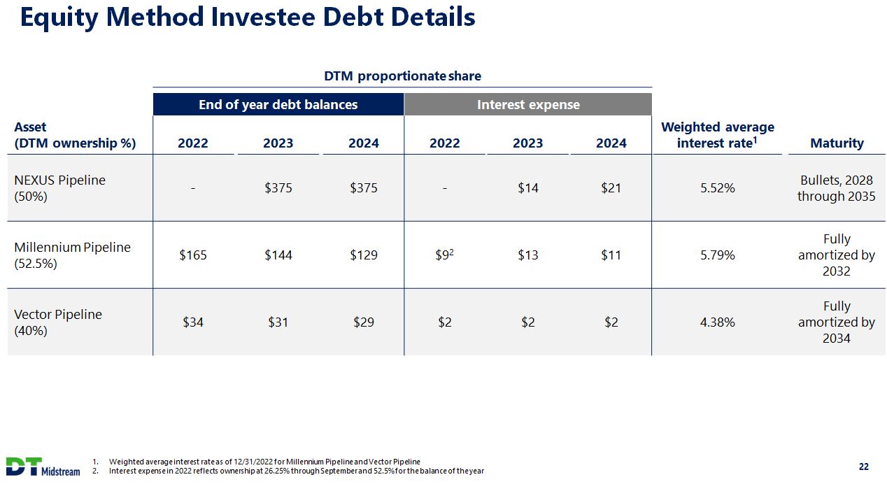 Equity Method Investee Debt Details DTM proportionate share Asset (DTM ownership %) NEXUS Pipeline (50%). Millennium Pipeline (52.5%) Vector Pipeline (40%) End of year debt balances 2022 $165 $34 2023 $375 $144 $31 2024 $375 $129 $29 Interest expense 2022 $9 2 $2 2023 $14 $13 $2 2024 $21 $11 $2 Weighted average interest rate1 5.52% 5.79% 4.38% Maturity Bullets, 2028 through 2035 Fully amortized by 2032 Fully amortized by 2034 DT Midstream 1. Weighted average interest rate as of 12/31/2022 for Millennium Pipeline and Vector Pipeline 2. Interest expense in 2022 reflects ownership at 26.25% through September and 52.5% for the balance of the year 22