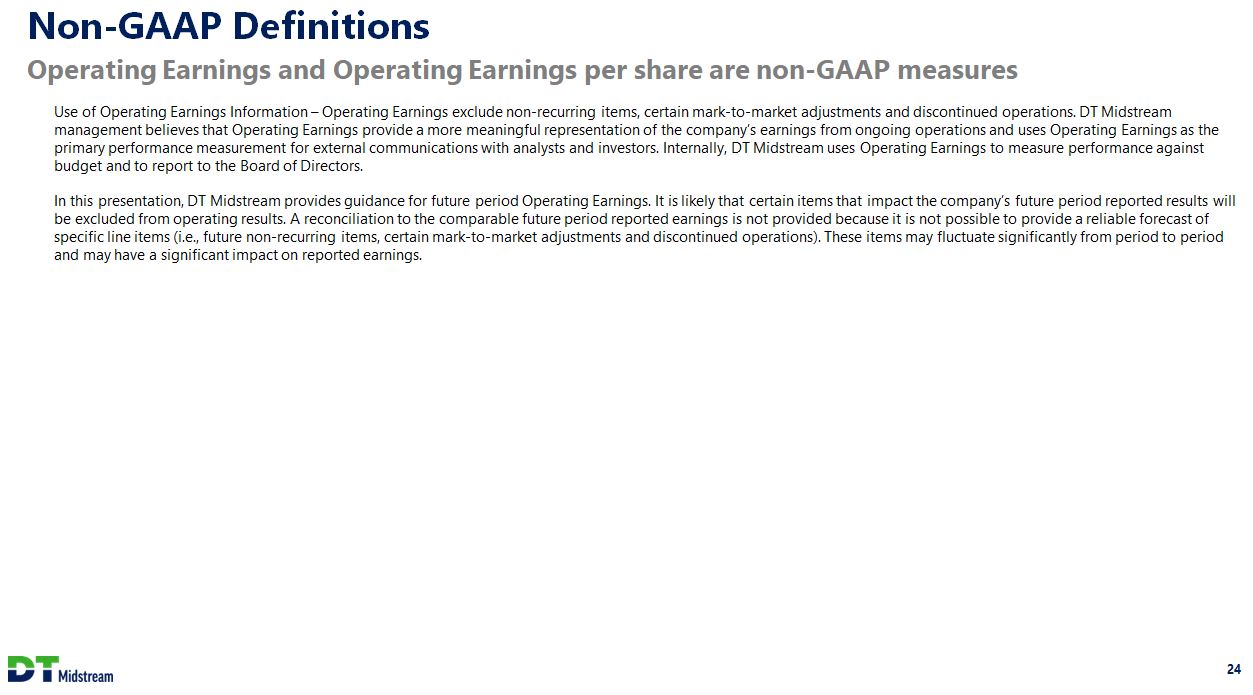 Non-GAAP Definitions Operating Earnings and Operating Earnings per share are non-GAAP measures Use of Operating Earnings Information - Operating Earnings exclude non-recurring items, certain mark-to-market adjustments and discontinued operations. DT Midstream management believes that Operating Earnings provide a more meaningful representation of the company's earnings from ongoing operations and uses Operating Earnings as the primary performance measurement for external communications with analysts and investors. Internally, DT Midstream uses Operating Earnings to measure performance against budget and to report to the Board of Directors. In this presentation, DT Midstream provides guidance for future period Operating Earnings. It is likely that certain items that impact the company's future period reported results will be excluded from operating results. A reconciliation to the comparable future period reported earnings is not provided because it is not possible to provide a reliable forecast of specific line items (i.e., future non-recurring items, certain mark-to-market adjustments and discontinued operations). These items may fluctuate significantly from period to period and may have a significant impact on reported earnings. DT Midstream 24