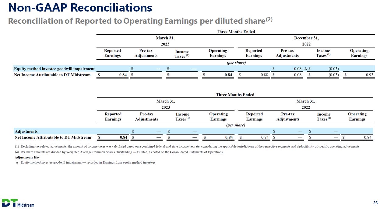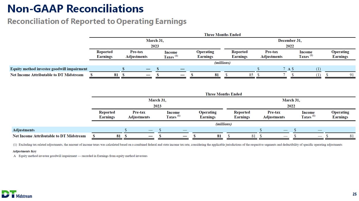Non-GAAP Reconciliations Reconciliation of Reported to Operating Earnings Three Months Ended March 31, 2023 December 31, 2022 Reported Earnings Pre-tax Adjustments Income Taxes(1) Operating Earnings Reported Earnings Pre-tax Adjustments Income Taxes(1) Operating Earnings (millions) Equity method investee goodwill impairment $ - $ - $ 7 A $ (1) Net Income Attributable to DT Midstream $ 81 $ - $ - $ 81 $ 85 $ 7 $ (1) $ 91 Three Months Ended March 31, 2023 March 31, 2022 Reported Earnings Pre-tax Adjustments Income Taxes(1) Operating Earnings Reported Earnings Pre-tax Adjustments Income Taxes(1) Operating Earnings (millions) Adjustments $ - $ - $ - $ - Net Income Attributable to DT Midstream $ 81 $ - $ - $ 81 $ 81 $ - $ - $ 81 (1) Excluding tax related adjustments, the amount of income taxes was calculated on a combined federal and state income tax rate, considering the applicable jurisdictions of the respective segments and deductibility of specific operating adjustments Adjustment Key A Equity method investee goodwill impairment - recorded in Earnings from equity method investees DT Midstream 25