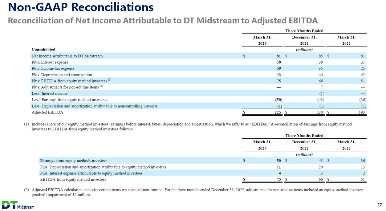 Non-GAAP Reconciliations Reconciliation of Net Income Attributable to DT Midstream to Adjusted EBITDA Pipeline Segment Three Months Ended March 31, 2023 December 31, 2022 March 31, 2022 Pipeline (millions) Net Income Attributable to DT Midstream $ 57 $ 58 $ 48 Plus: Interest expense 16 16 13 Plus: Income tax expense 28 22 16 Plus: Depreciation and amortization 16 17 16 Plus: EBITDA from equity method investees(1) 75 66 51 Plus: Adjustments for non-routine items(2) - 7 - Less: Earnings from equity method investees (50) (43) (36) Less: Depreciation and amortization attributable to noncontrolling interests (1) (1) (1) Adjusted EBITDA $ 141 $ 142 $ 107 (1) Includes share of our equity method investees' earnings before interest, taxes, depreciation and amortization, which we refer to as "EBITDA." A reconciliation of earnings from equity method investees to EBITDA from equity method investees follows: Three Months Ended March 31, 2023 December 31, 2022 March 31, 2022 (millions) Earnings from equity methods investees $50 $43 $36 Plus: Depreciation and amortization attributable to equity method investees 21 20 13 Plus: Interest expense attributable to equity method investees 4 3 2 EBITDA from equity method investees $ 75 $ 66 $ 51 (2) Adjusted EBITDA calculation excludes certain items we consider non-routine. For the three months ended December 31, 2022, adjustments form non-routine items included an equity method investee goodwill impairment of $7 million DT Midstream 28