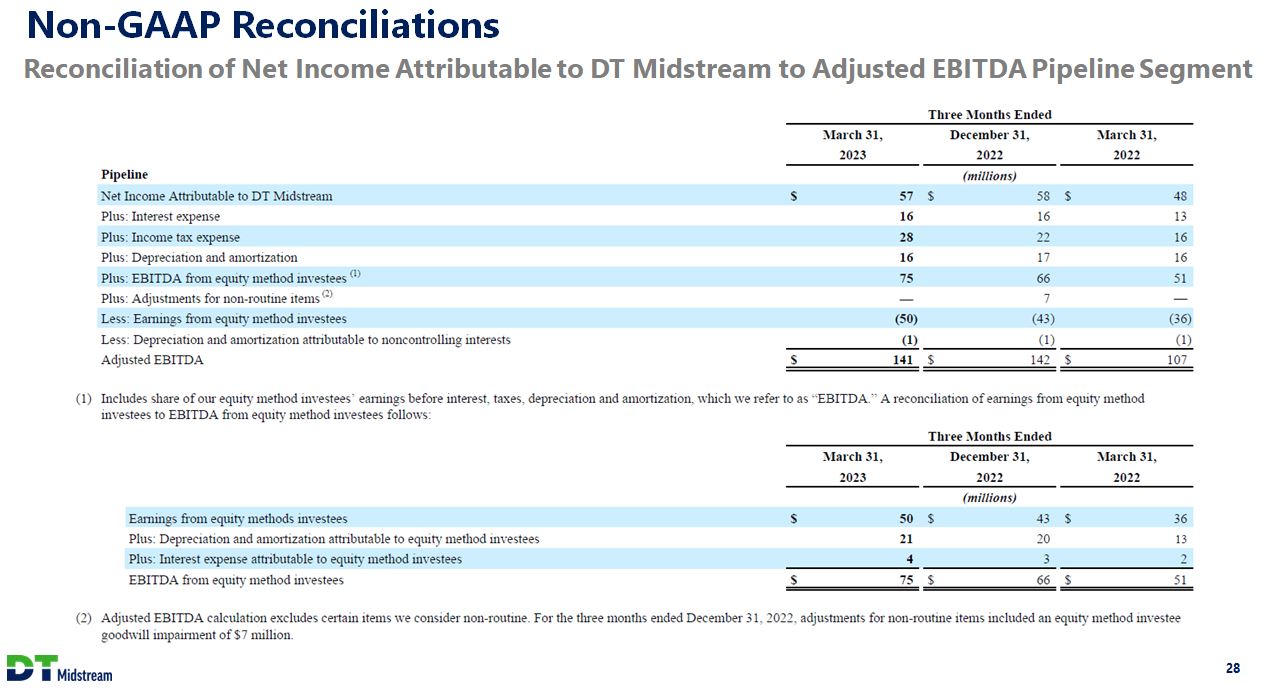 Non-GAAP Reconciliations Reconciliation of Net Income Attributable to DT Midstream to Adjusted EBITDA Three Months Ended March 31, 2023 December 31, 2022 March 31, 2022 Consolidated (millions) Net Income Attributable to DT Midstream $ 81 $ 85 $ 81 Plus: Interest expense 38 38 31 Plus: Income tax expense 39 35 25 Plus: Depreciation and amortization 43 44 42 Plus EBITDA from equity method investees(1) 75 66 51 Plus Adjustments for non-routine items(2) - 7 - Less: Interest income - (1) - Less: Earnings from equity method investees (50) (43) (36) Less: Depreciation and amortization attributable to noncontrolling interests (1) (1) (1) Adjusted EBITDA $ 225 $ 230 $ 193 (1) Includes share of our equity method investees' earnings before interest, taxes, depreciation and amortization, which we refer to as "EBITDA." A reconciliation of earnings from equity method investees to EBITDA from equity method investees follows: Three Months Ended March 31, 2023 December 31, 2022 March 31, 2022 (millions) Earnings from equity methods investees $ 50 $ 43 $ 36 Plus: Depreciation and amortization attributable to equity method investees 21 20 13 Plus: Interest expense attributable to equity method investees 4 3 2 EBITDA from equity method investees $ 75 $ 66 $ 51 (2) Adjusted EBITDA calculation excludes certain items we consider non-routine. For the three months ended December 31, 2022, adjustments for non-routine items included an equity method investee goodwill impairment of $7 million. DT Midstream 27