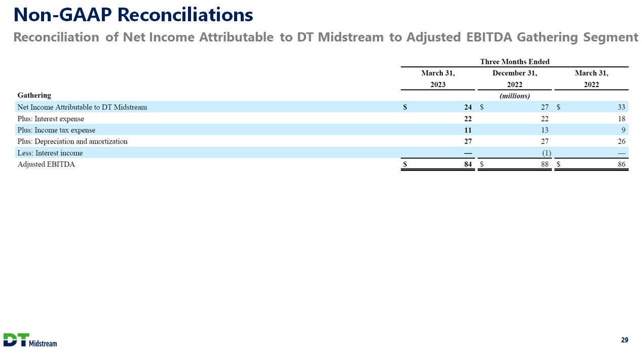 Non-GAAP Reconciliations Reconciliation of Net Income Attributable to DT Midstream to Adjusted EBITDA Gathering Segment Three Months Ended March 31, 2023 December 31, 2022 March 31, 2022 Gathering (millions) Net Income Attributable to DT Midstream $ 24 $ 27 $ 33 Plus: Interest expense 22 22 18 Plus: Income tax expense 11 13 9 Plus: Depreciation and amortization 27 27 26 Less: Interest income - (1) - Adjusted EBITDA $ 84 $ 88 $ 86 DT Midstream 29