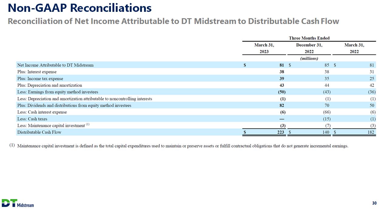 Non-GAAP Reconciliations Reconciliation of Net Income Attributable to DT Midstream to Distributable Cash Flow Three Months Ended March 31, 2023 December 31, 2022 March 31, 2022 (millions) Net Income Attributable to DT Midstream $ 81 $ 85 $ 81 Plus: Interest expense 38 38 31 Plus: Income tax expense 39 35 25 Plus: Depreciation and amortization 43 44 42 Less: Earnings from equity method investees (50) (43) (36) Less: Depreciation and amortization attributable to noncontrolling interests (1) (1) (1) Plus: Dividends and distributions from equity method investees 82 70 50 Less: Cash interest expense (6) (66) (6) Less: Cash taxes - (15) (1) Less: Maintenance capital investment(1) (3) (7) (3) Distributable Cash Flow $ 223 $ 140 $ 182 (1) Maintenance capital investment is defined as the total capital expenditures used to maintain or preserve assets or fulfill contractual obligations that do not generate incremental earnings. DT Midstream 30