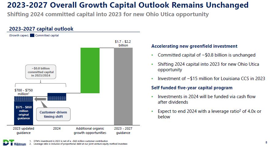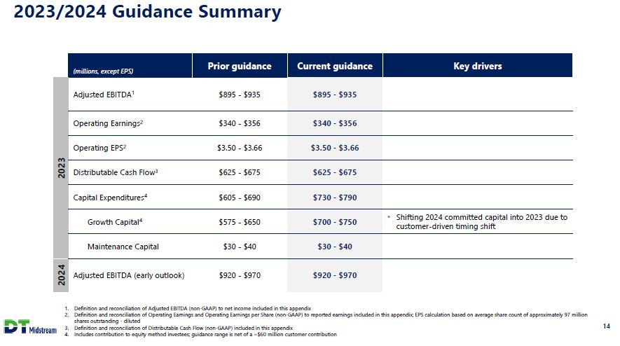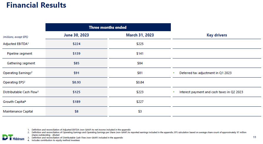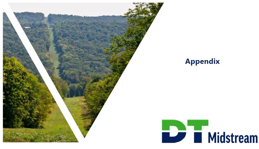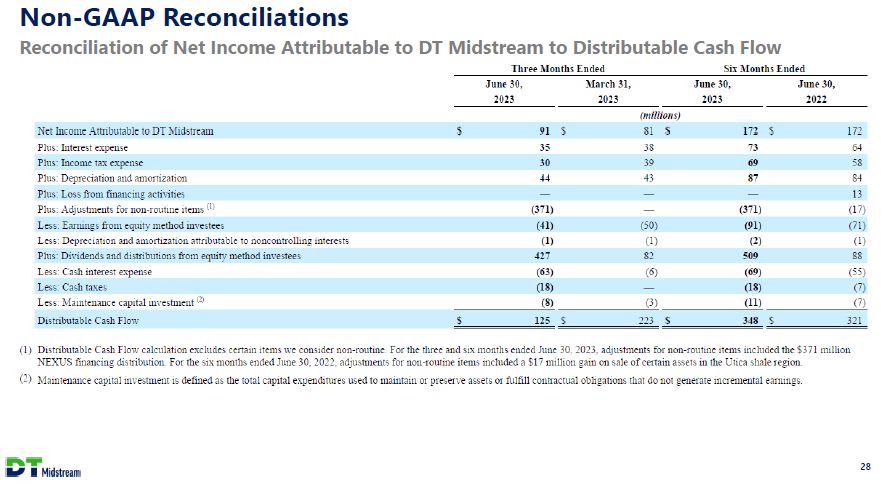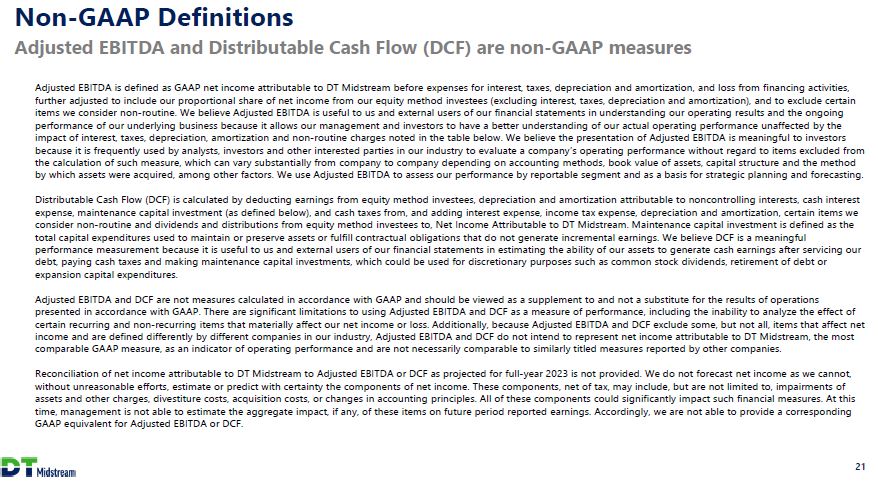 Non-GAAP Definitions Adjusted EBITDA and Distributable Cash Flow (DCF) are non-GAAP measures Adjusted EBITDA is defined as GAAP net income attributable to DT Midstream before expenses for interest, taxes, depreciation and amortization,and loss from financing activities, further adjusted to include our proportional share of net income from our equity method investees (excluding interest, taxes, depreciation and amortization), and to exclude certain items we consider non-routine. We believe Adjusted EBITDA is useful to us and external users of our financial statements in understanding our operating results and the ongoing performance of our underlying business because it allows our management and investors to have a better understanding of our actual operating performance unaffected by the impact of interest, taxes, depreciation, amortization and non-routine charges noted in the table below. We believe the presentation of Adjusted EBITDA is meaningful to investors because it is frequently used by analysts, investors and other interested parties in our industry to evaluate a company's operating performance without regard to items excluded from the calculation of such measure, which can vary substantially from company to company depending on accounting methods, book value of assets, capital structure and the method by which assets were acquired, among other factors. We use Adjusted EBITDA to assess our performance by reportable segment and as a basis for strategic planning and forecasting. Distributable Cash Flow (DCF)is calculated by deducting earnings from equity method investees, depreciation and amortization attributable to noncontrolling interests, cash interest expense, maintenance capital investment (as defined below), and cash taxes from, and adding interest expense, income tax expense, depreciation and amortization, certain items we consider non-routine and dividends and distributions from equity method investees to, Net Income Attributable to DT Midstream. Maintenance capital investment is defined as the total capital expenditures used to maintain or preserve assets or fulfill contractual obligations that do not generate incremental earnings. We believe DCF is a meaningful performance measurement because it is useful to us and external users of our financial statements in estimating the ability of our assets to generate cash earnings after servicing our debt, paying cash taxes and making maintenance capital investments, which could be used for discretionary purposes such as common stock dividends, retirement of debt or expansion capital expenditures. Adjusted EBITDA and DCF are not measures calculated in accordance with GAAP and should be viewed as a supplement to and not a substitute for the results of operations presented in accordance with GAAP. There are significant limitations to using Adjusted EBITDA and DCF as a measure of performance, including the inability to analyze the effect of certain recurring and non-recurring items that materially affect our net income or loss. Additionally, because Adjusted EBITDA and DCF exclude some, but not all, items that affect net income and are defined differently by different companies in our industry, Adjusted EBITDA and DCF do not intend to represent net income attributable to DT Midstream, the most comparable GAAP measure, as an indicator of operating performance and are not necessarily comparable to similarly titled measures reported by other companies. Reconciliation of net income attributable to DT Midstream to Adjusted EBITDA or DCF as projected for full-year 2023 is not provided. We do not forecast net income as we cannot, without unreasonable efforts, estimate or predict with certainty the components of net income. These components, net of tax, mayinclude, but are not limited to, impairments of assets and other charges, divestiture costs, acquisition costs, or changes in accounting principles. All of these components could significantly impact such financial measures. At this time, management is not able to estimate the aggregate impact, if any, of these items on future period reported earnings. Accordingly, we are not able to provide a corresponding GAAP equivalent for Adjusted EBITDA or DCF. 21