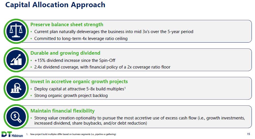 Capital Allocation Approach Preserve balance sheet strength Current plan naturally deleverages the business into mid 3x's over the 5-year period Committed to long-term 4x leverage ratio ceiling Durable and growing dividend +15% dividend increase since the Sspin-Off 2. 4x dividend coverage, with financial policy of a 2x coverage ratio floor Invest in accretive organic growth projects Deploy capital at attractive 5-8x build multiples1 Strong organic growth project backlog Maintain financial flexibility Strong value creation optionality to pursue the most accretive use of excess cash flow (i.e., growth investments,increased dividend, share buybacks, and/or debt reduction) 1. New project build multiples differ based on business segments (i.e., pipeline vs gathering) 15