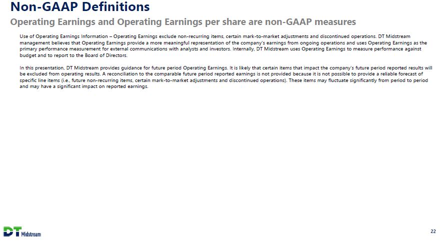 Non-GAAP Definitions Operating Earnings and Operating Earnings per share are non-GAAP measures Use of Operating Earnings Information-Operating Earnings exclude non-recurring items, certain mark-to-market adjustments and discontinued operations. DT Midstream management believes that Operating Earnings provide a more meaningful representation of the company's earnings from ongoing operations and uses Operating Earnings as the primary performance measurement for external communications with analysts and investors. Internally, DT Midstream uses Operating Earnings to measure performance against budget and to report to the Board of Directors. In this presentation, DT Midstream provides guidance for future period Operating Earnings. It is likely that certain items that impact the company's future period reported results will be excluded from operating results. A reconciliation to the comparable future period reported earnings is not provided because it is not possible to provide a reliable forecast of specific line items (i.e., future non-recurring items, certain mark-to-market adjustments and discontinued operations). These items may fluctuate significantly from period to period and may have a significant impact on reported earnings. 22