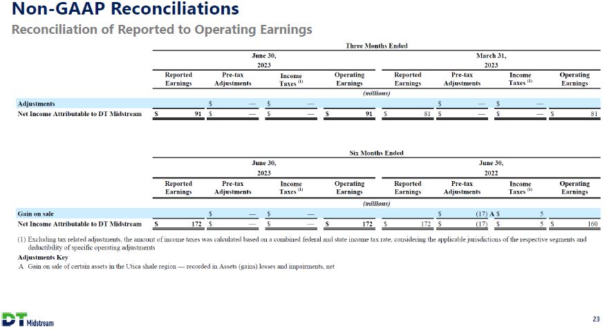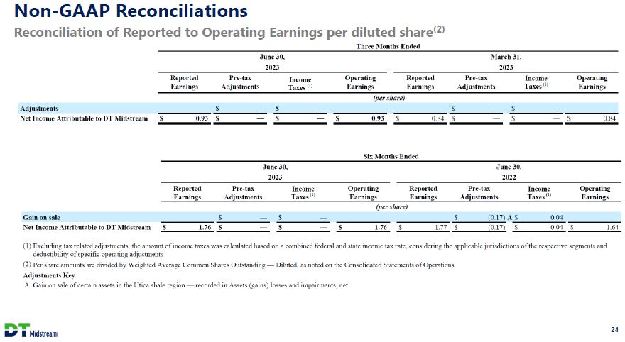 Non-GAAP Reconciliations Reconciliation of Reported to Operating Earnings Three Months Ended June 30, 2023 March 31, 2023 Reported Earnings Pre-tax Adjustments Income Taxes(1) Operating Earnings Reported Earnings Pre-tax Adjustments Income Taxes(1) Operating Earnings (millions) Adjustments $ - $ - $ - $ - Net Income Attributable to DT Midstream $ 91 $ - $ - $ 91 $ 81 $ - $ - $ 81 Six Months Ended June 30, 2023 June 30, 2022 Reported Earnings Pre-tax Adjustments Income Taxes(1) Operating Earnings Reported Earnings Pre-tax Adjustments Income Taxes(1) Operating Earnings (millions) Gain on sale $ - $ - $ (17) $ $ 5 Net Income Attributable to DT Midstream $ 172 $ - $ - $ 172 $ 172 $ (17) $ 5 $ 160 (1) Excluding tax related adjustments, the amount of income taxes was calculated based on a combined federal and state income tax rate, considering the applicable jurisdicitons of the respective segments and deductibility of specific operating adjustments Adjustments Key A Gain on sale of certain assets in the Utica shale region - recorded in Assets (gains) losses and impairments, net 23