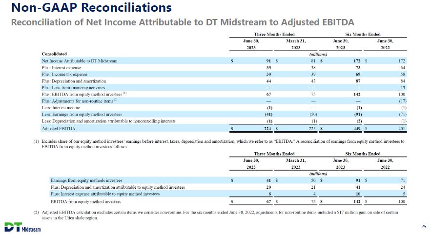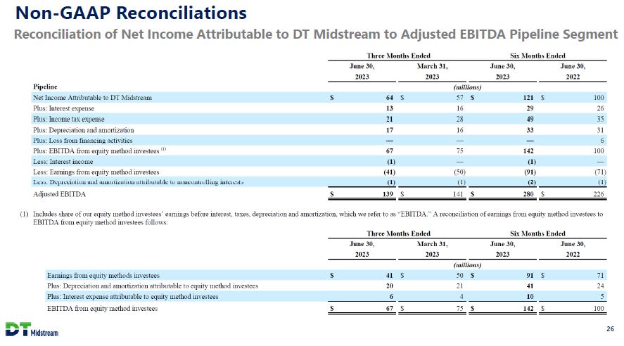 Non-GAAP Reconciliations Reconciliation of Net Income Attributable to DT Midstream to Adjusted EBITDA Three Months Ended Six Months Ended June 30, 2023 March 31, 2023 June 30, 2023 June 30, 2022 Consolidated (millions) Net Income Attributable to DT Midstream $ 91 $ 81 $ 172 $ 172 Plus: Interest expense 35 38 73 64 Plus: Income tax expense 30 39 69 58 Plus: Depreciation and amortization 44 43 87 84 Plus: Loss from financing activities -- -- -- 13 Plus: EBITDA from equity method investees(1) 67 75 142 100 Plus: Adjustments for non-routine items(2) -- -- -- (17) Less: Interest income (1) -- (1) (1) Less: Earnings from equity method investees (41) (50) (91) (71) Less: Depreciation and amortization attributable to noncontrolling interests (1) (1) (2) (1) Adjusted EBITDA $ 224 $ 225 $ 449 $ 401 (1) Includes share of our equity method investees' earnings before interest, taxes, depreciation and amortization. which we refer to as "EBITDA." A reconciliation of earnings from equity method investees to EBITDA from equity method investees follows: Three Months Ended Six Months Ended June 30, 2023 March 31, 2023 June 30, 2023 June 30, 2022 (millions) Earnings from equity methods investees $ 41 $ 50 $ 91 $ 71 Plus: Depreciation and amortization attributable to equity method investees 20 21 41 24 Plus: Interest expense attributable to equity method investees 6 4 10 5 EBITDA from equity method investees $ 67 $ 75 $ 142 $ 100 (2) Adjusted EBITDA calculation excludes certain items we consider non-routine. For the six months ended June 30, 2022, adjustments for non-routine items included a $17 million gain on sale of certain assets in the Utica shale region. 25