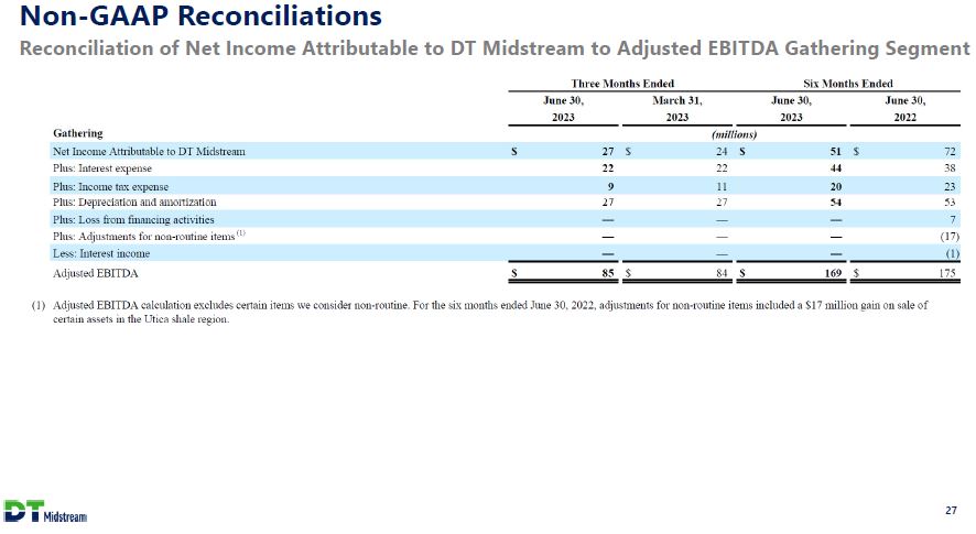 Non-GAAP Reconciliations Reconciliation of Net Income Attributable to DT Midstream to Adjusted EBITDA Pipeline Segment Three Months Ended Six Months Ended June 30, 2023 March 31, 2023 June 30, 2023 June 30, 2022 Pipeline (millions) Net Income Attributable to DT Midstream $ 64 $ 57 $ 121 $ 100 Plus: Interest expense 13 16 29 26 Plus: Income tax expense 21 28 49 35 Plus: Depreciation and amortization 17 16 33 31 Plus: Loss from financing activities -- -- -- 6 Plus: EBITDA from equity method investees (1) 67 75 142 100 Less: Interest income (1) -- (1) -- Less: Earnings from equity method investees (41) (50) (91) (71) Less: Depreciation and amortization attributable to noncontrolling interests (1) (1) (2) (1) Adjusted EBITDA $ 139 $ 141 $ 280 $ 226 (1) Includes share of our equity method investees' earnings before interest, taxes, depreciation and amortization, which we refer to as "EBITDA." A reconciliation of earnings from equity method investees to EBITDA from equity method investees follows: Three Months Ended Six Months Ended June 30, 2023 March 31, 2023 June 30, 2023 June 30, 2022 (millions) Earnings from equity methods investees $ 41 $ 50 $ 91 $ 71 Plus: Depreciation and amortization attributable to equity method investees 20 21 41 24 Plus: Interest expense attributable to equity method investees 6 4 10 5 EBITDA from equity method investees $ 67 $ 75 $ 142 $ 100 26