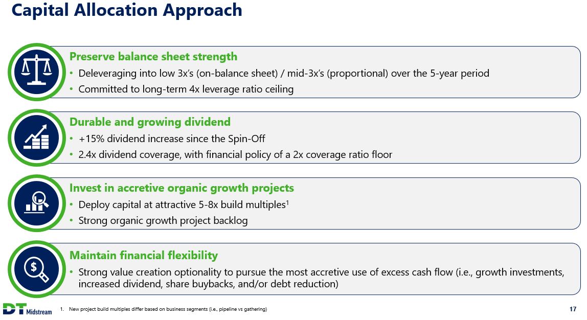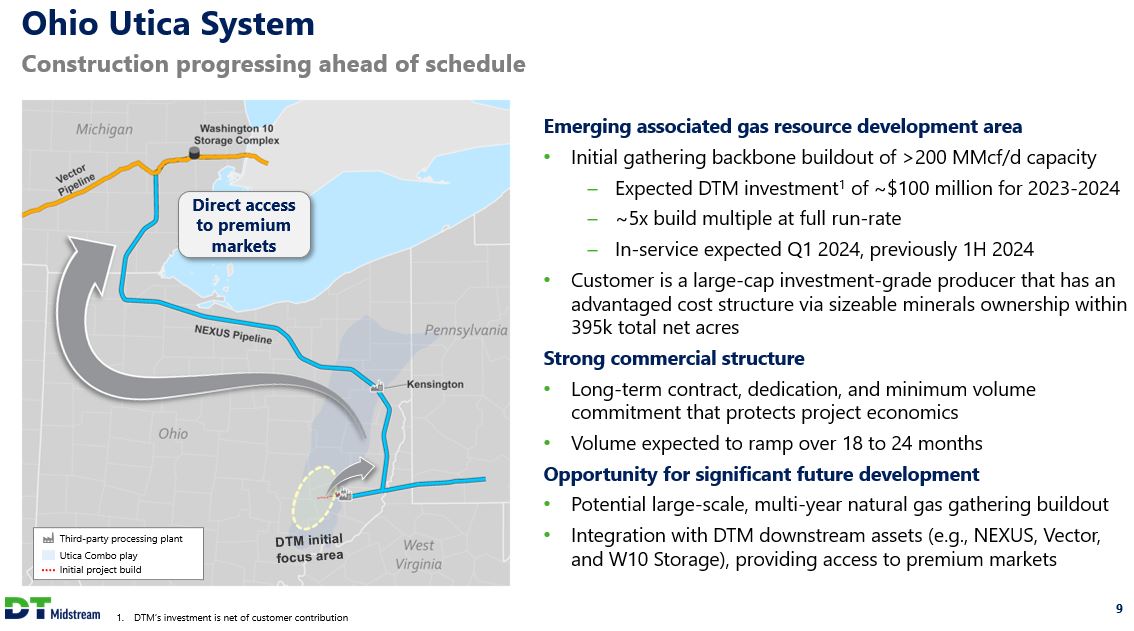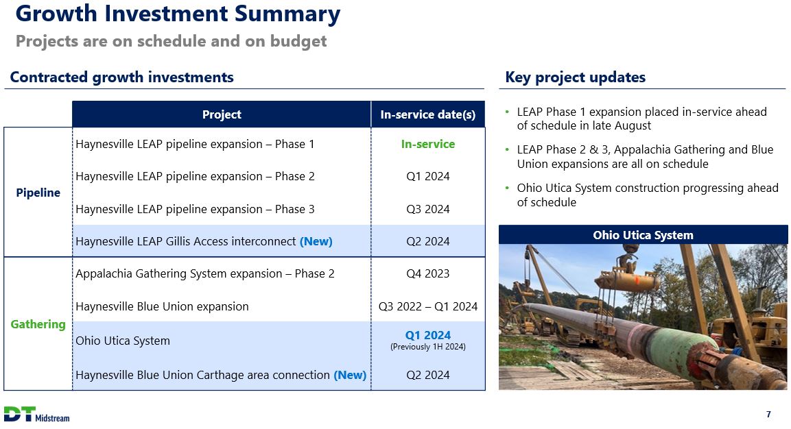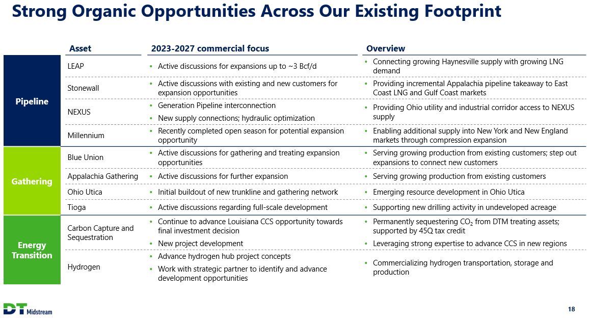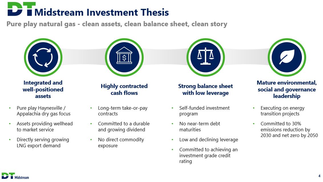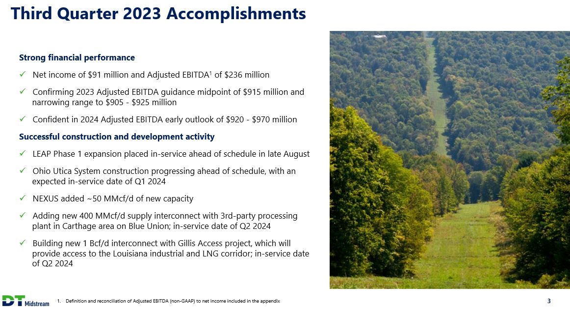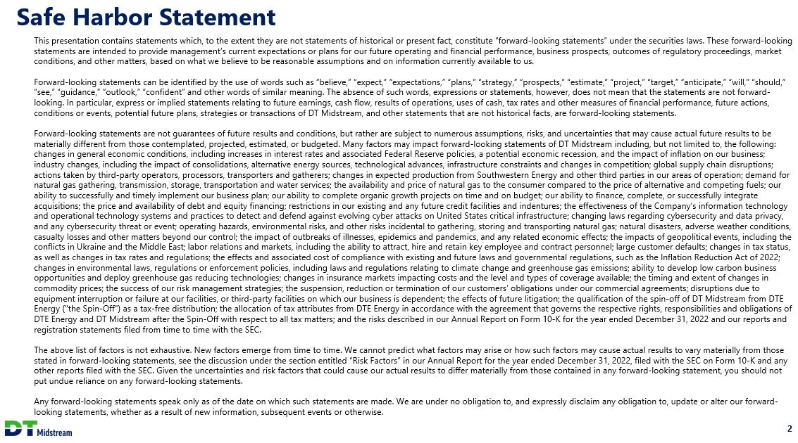 2 Safe Harbor Statement New slide This presentation contains statements which, to the extent they are not statements of historical or present fact, constitute “fo rward - looking statements” under the securities laws. These forward - looking statements are intended to provide management’s current expectations or plans for our future operating and financial performa nce , business prospects, outcomes of regulatory proceedings, market conditions, and other matters, based on what we believe to be reasonable assumptions and on information currently available t o u s. Forward - looking statements can be identified by the use of words such as “believe,” “expect,” “expectations,” “plans,” “strategy ,” “prospects,” “estimate,” “project,” “target,” “anticipate,” “will,” “should,” “see,” “guidance,” “outlook,” “confident” and other words of similar meaning. The absence of such words, expressions or state men ts, however, does not mean that the statements are not forward - looking. In particular, express or implied statements relating to future earnings, cash flow, results of operations, uses of cas h, tax rates and other measures of financial performance, future actions, conditions or events, potential future plans, strategies or transactions of DT Midstream, and other statements that are not h ist orical facts, are forward - looking statements. Forward - looking statements are not guarantees of future results and conditions, but rather are subject to numerous assumptions, risks, and uncertainties that may cause actual future results to be materially different from those contemplated, projected, estimated, or budgeted. Many factors may impact forward - looking stateme nts of DT Midstream including, but not limited to, the following: changes in general economic conditions, including increases in interest rates and associated Federal Reserve policies, a pote nti al economic recession, and the impact of inflation on our business; industry changes, including the impact of consolidations, alternative energy sources, technological advances, infrastructure con straints and changes in competition; global supply chain disruptions; actions taken by third - party operators, processors, transporters and gatherers; changes in expected production from Southwestern Energy and other third parties in our areas of operation; demand for natural gas gathering, transmission, storage, transportation and water services; the availability and price of natural gas to th e consumer compared to the price of alternative and competing fuels; our ability to successfully and timely implement our business plan; our ability to complete organic growth projects on time and o n b udget; our ability to finance, complete, or successfully integrate acquisitions; the price and availability of debt and equity financing; restrictions in our existing and any future credit fac ili ties and indentures; the effectiveness of the Company’s information technology and operational technology systems and practices to detect and defend against evolving cyber attacks on United States critica l i nfrastructure; changing laws regarding cybersecurity and data privacy, and any cybersecurity threat or event; operating hazards, environmental risks, and other risks incidental to gathering, stori ng and transporting natural gas; natural disasters, adverse weather conditions, casualty losses and other matters beyond our control; the impact of outbreaks of illnesses, epidemics and pandemics, and any rel ated economic effects; the impacts of geopolitical events, including the conflicts in Ukraine and the Middle East; labor relations and markets, including the ability to attract, hire and retain key emp loyee and contract personnel; large customer defaults; changes in tax status, as well as changes in tax rates and regulations; the effects and associated cost of compliance with existing and future laws and governmental regulations, such as the Inflation Reduction Act of 2022; changes in environmental laws, regulations or enforcement policies, including laws and regulations relating to climate change an d greenhouse gas emissions; ability to develop low carbon business opportunities and deploy greenhouse gas reducing technologies; changes in insurance markets impacting costs and the level and ty pes of coverage available; the timing and extent of changes in commodity prices; the success of our risk management strategies; the suspension, reduction or termination of our customers’ o bli gations under our commercial agreements; disruptions due to equipment interruption or failure at our facilities, or third - party facilities on which our business is dependent; the effects o f future litigation; the qualification of the spin - off of DT Midstream from DTE Energy ("the Spin - Off") as a tax - free distribution; the allocation of tax attributes from DTE Energy in accordance with the agre ement that governs the respective rights, responsibilities and obligations of DTE Energy and DT Midstream after the Spin - Off with respect to all tax matters; and the risks described in our Annual Report on Form 10 - K for the year ended December 31, 2022 and our reports and registration statements filed from time to time with the SEC. The above list of factors is not exhaustive. New factors emerge from time to time. We cannot predict what factors may arise o r h ow such factors may cause actual results to vary materially from those stated in forward - looking statements, see the discussion under the section entitled “Risk Factors” in our Annual Report for the year ended December 31, 2022, filed with the SEC on Form 10 - K and any other reports filed with the SEC . Given the uncertainties and risk factors that could cause our actual results to differ materially from those contained in a ny forward - looking statement, you should not put undue reliance on any forward - looking statements. Any forward - lookin