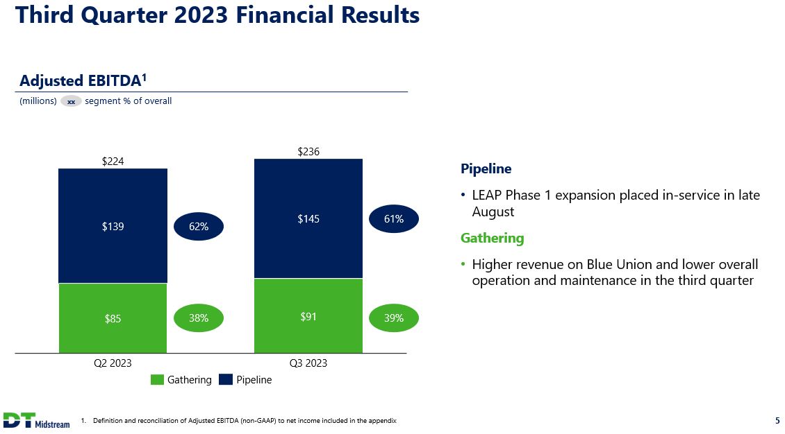 1. Definition and reconciliation of Adjusted EBITDA (non - GAAP) to net income included in the appendix 3 Third Quarter 2023 Accomplishments Strong financial performance x Net income of $91 million and Adjusted EBITDA 1 of $236 million x Confirming 2023 Adjusted EBITDA guidance midpoint of $915 million and narrowing range to $905 - $925 million x Confident in 2024 Adjusted EBITDA early outlook of $920 - $970 million Successful construction and development activity x LEAP Phase 1 expansion placed in - service ahead of schedule in late August x Ohio Utica System construction progressing ahead of schedule, with an expected in - service date of Q1 2024 x NEXUS added ~50 MMcf /d of new capacity x Adding new 400 MMcf /d supply interconnect with 3rd - party processing plant in Carthage area on Blue Union; in - service date of Q2 2024 x Building new 1 Bcf/d interconnect with Gillis Access project, which will provide access to the Louisiana industrial and LNG corridor; in - service date of Q2 2024 TBD - Construction photo