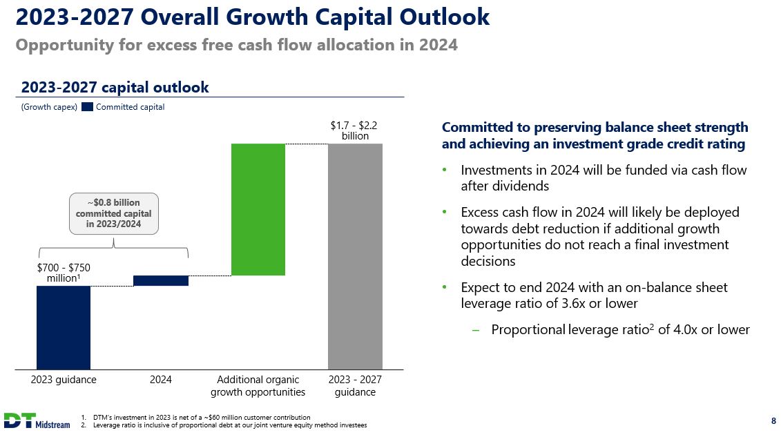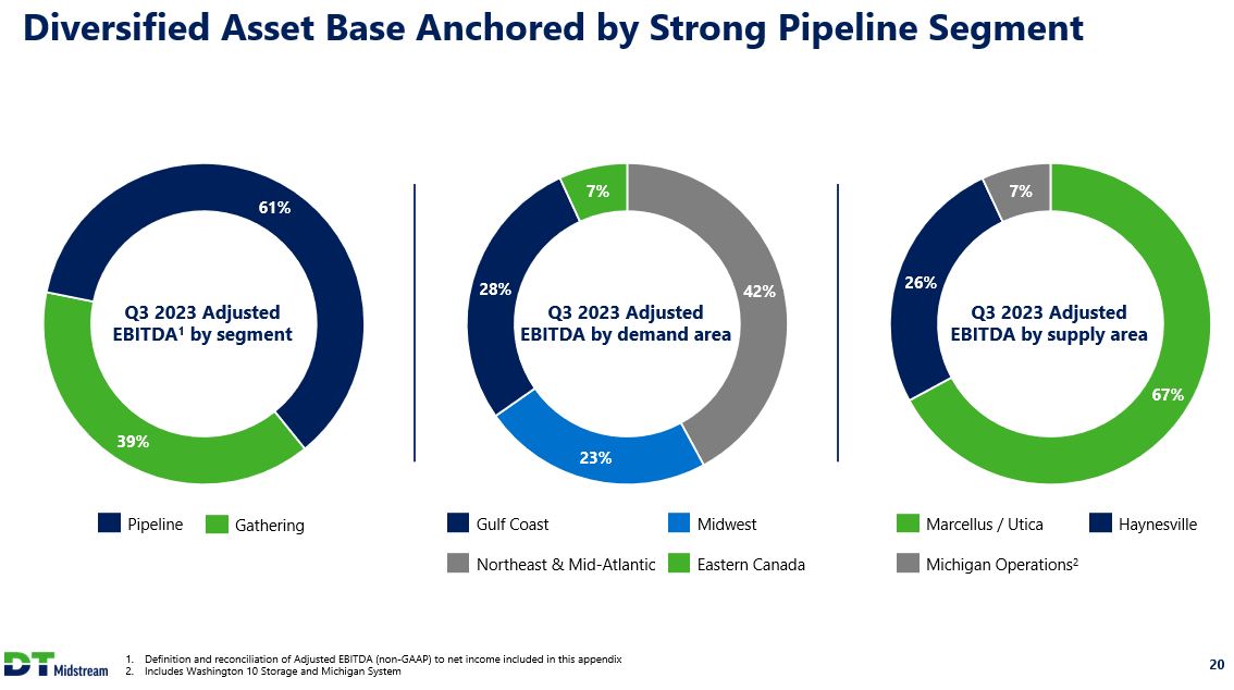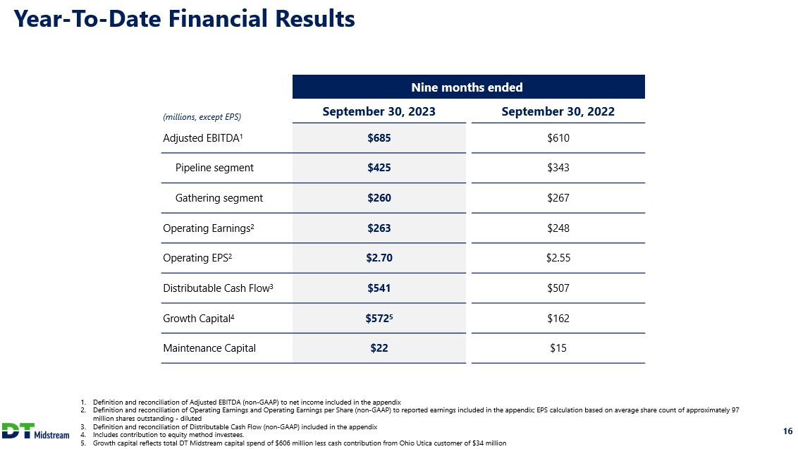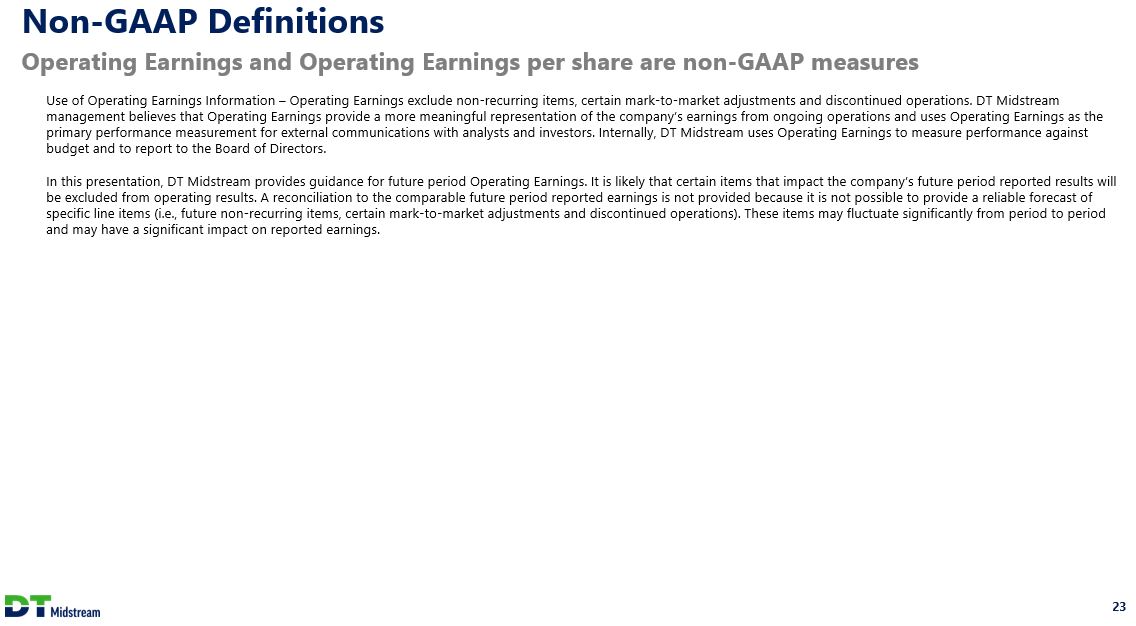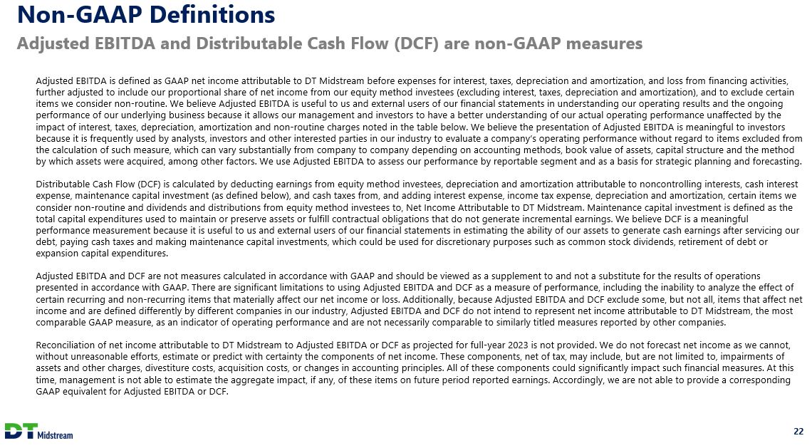 22 Non - GAAP Definitions Adjusted EBITDA and Distributable Cash Flow (DCF) are non - GAAP measures New slide Adjusted EBITDA is defined as GAAP net income attributable to DT Midstream before expenses for interest, taxes, depreciation and amortization , and loss from financing activities, further adjusted to include our proportional share of net income from our equity method investees (excluding interest, taxes, depreciation and amortization), and to exclude certain items we consider non - routine. We believe Adjusted EBITDA is useful to us and external users of our financial statements in understanding our operating results and the ongoing performance of our underlying business because it allows our management and investors to have a better understanding of our a ctu al operating performance unaffected by the impact of interest, taxes, depreciation, amortization and non - routine charges noted in the table below. We believe the presentat ion of Adjusted EBITDA is meaningful to investors because it is frequently used by analysts, investors and other interested parties in our industry to evaluate a company’s ope rat ing performance without regard to items excluded from the calculation of such measure, which can vary substantially from company to company depending on accounting methods, book v alu e of assets, capital structure and the method by which assets were acquired, among other factors. We use Adjusted EBITDA to assess our performance by reportable segment and as a basis for strategic planning and forecasting. Distributable Cash Flow (DCF) is calculated by deducting earnings from equity method investees, depreciation and amortization attributable to noncontrollin g interests, cash interest expense, maintenance capital investment (as defined below), and cash taxes from, and adding interest expense, income tax expe nse , depreciation and amortization, certain items we consider non - routine and dividends and distributions from equity method investees to, Net Income Attributable to DT Midstream. M aintenance capital investment is defined as the total capital expenditures used to maintain or preserve assets or fulfill contractual obligations that do not generate increm ent al earnings. We believe DCF is a meaningful performance measurement because it is useful to us and external users of our financial statements in estimating the ability o f o ur assets to generate cash earnings after servicing our debt, paying cash taxes and making maintenance capital investments, which could be used for discretionary purposes such as co mmo n stock dividends, retirement of debt or expansion capital expenditures. Adjusted EBITDA and DCF are not measures calculated in accordance with GAAP and should be viewed as a supplement to and not a substitute for the resu lts of operations presented in accordance with GAAP. There are significant limitations to using Adjusted EBITDA and DCF as a measure of performance, including the inability to analyze the effect of certain recurring and non - recurring items that materially affect our net income or loss. Additionally, because Adjusted EBITDA and DCF exclude some, but not all, items that affect net income and are defined differently by different companies in our industry, Adjusted EBITDA and DCF do not intend to represent net income attributable to DT Midstream, the most comparable GAAP measure, as an indicator of operating performance and are not necessarily comparable to similarly titled meas ure s reported by other companies. Reconciliation of net income attributable to DT Midstream to Adjusted EBITDA or DCF as projected for full - year 2023 is not provi ded. We do not forecast net income as we cannot, without unreasonable efforts, estimate or predict with certainty the components of net income. These components, net of tax, may include, but are not limited to, impairments of assets and other charges, divestiture costs, acquisition costs, or changes in accounting principles. All of these components cou ld significantly impact such financial measures. At this time, management is not able to estimate the aggregate impact, if any, of these items on future period reported earnings. Acc ord ingly, we are not able to provide a corresponding GAAP equivalent for Adjusted EBITDA or DCF.