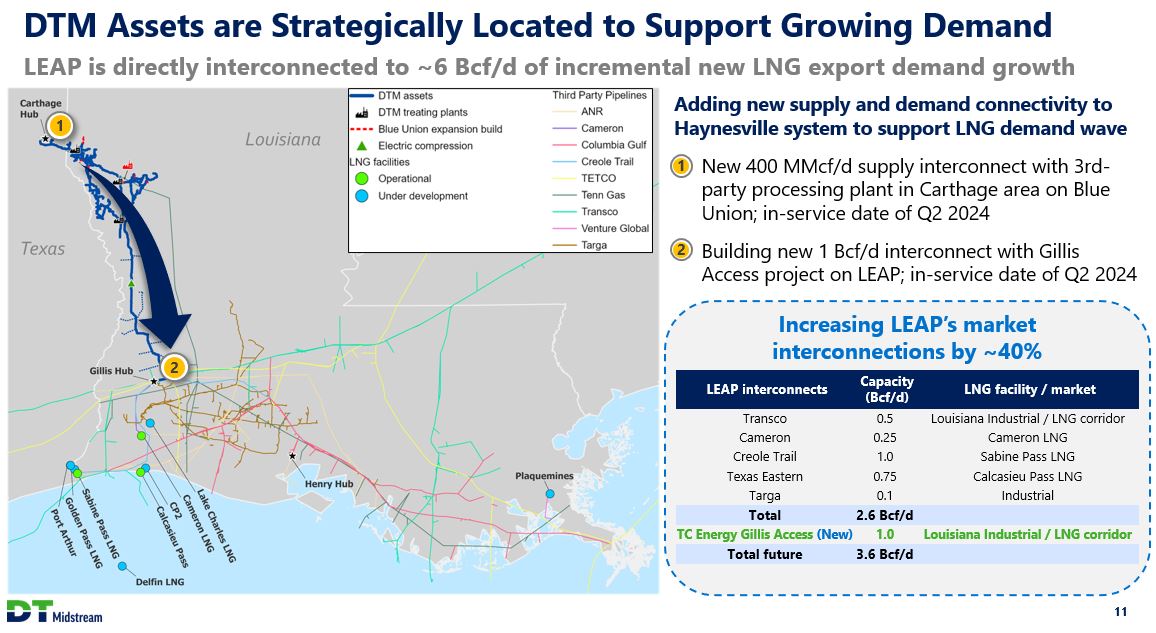 10 Phase 1 LEAP Expansion Placed In - Service Early commissioning of Phase 1 expansion increases LEAP capacity from 1.0 Bcf/d to 1.3 Bcf/d DTM assets DTM treating plants LNG facilities Blue Union expansion build Electric compression Operational Under development Contracted LEAP capacity ( Bcf /d) In - service Original Phase 1 expansion August 2023 Phase 2 expansion Q1 2024 Phase 3 expansion Q3 2024 Total Full expansion opportunity 1.0 1.9 0.3 0.4 0.2 Further LEAP expansions on - track and on - budget to increase capacity from 1.3 Bcf/d to 1.9 Bcf/d • Projects include a combination of looping and compression • Expansions are underpinned by take - or - pay contracts In active discussions for additional expansions • Capital efficient, lower - risk expansions provide timely access to growing LNG demand • LEAP can be further expanded up to ~3 Bcf/d 3.0 Haynesville / Louisiana Gulf Coast